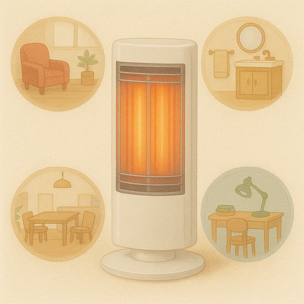 コンパクトで持ち運びしやすく、脱衣所やキッチン、足元の補助暖房など、スポット使いにぴったりです。