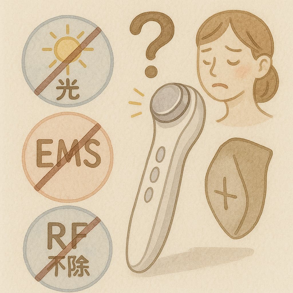光ケアやEMSは比較的安全な設計ですが、敏感肌の人は刺激を感じやすい場合があるため、使用前のテストや弱出力からのスタートが推奨されます。