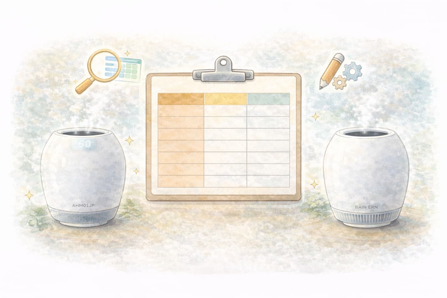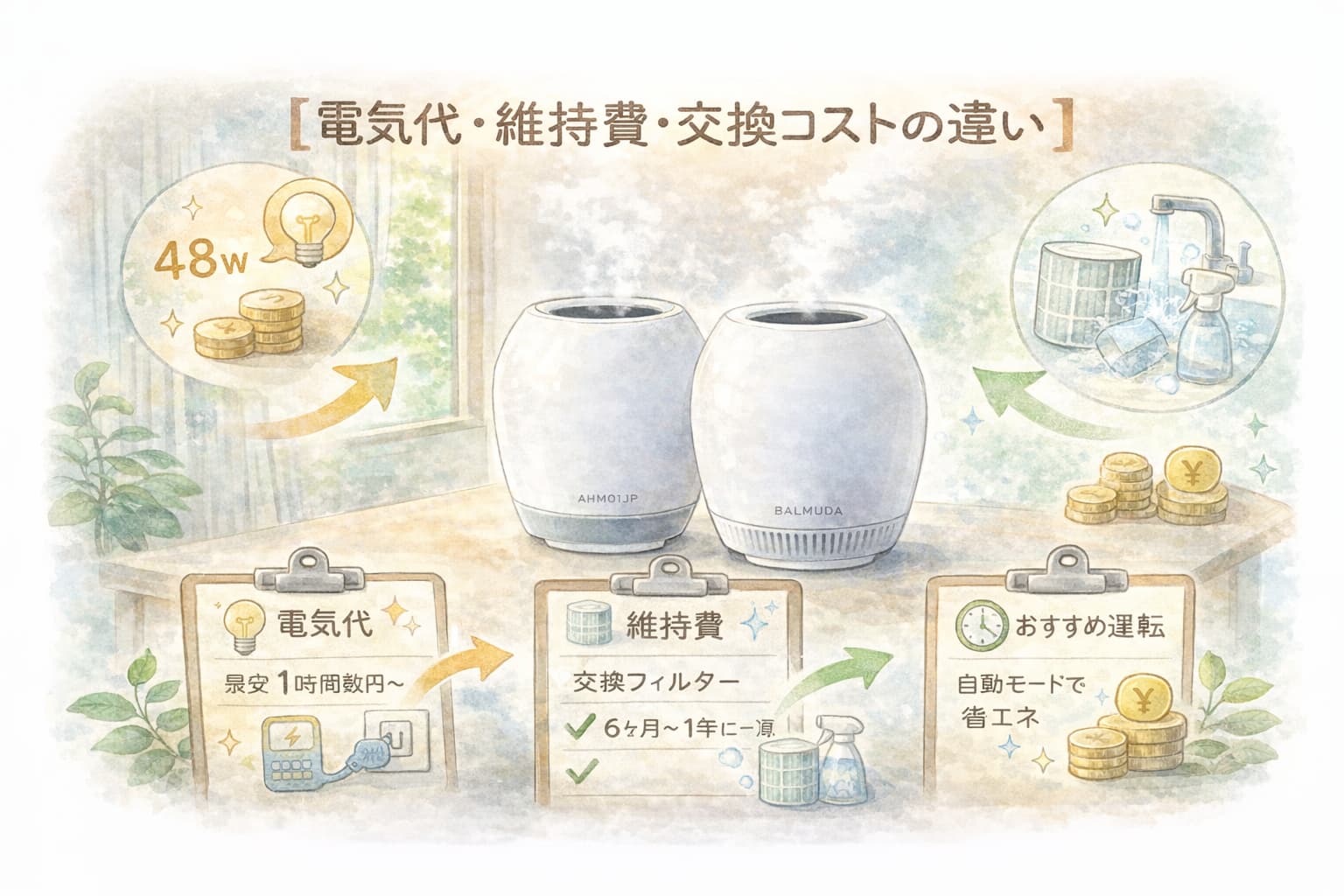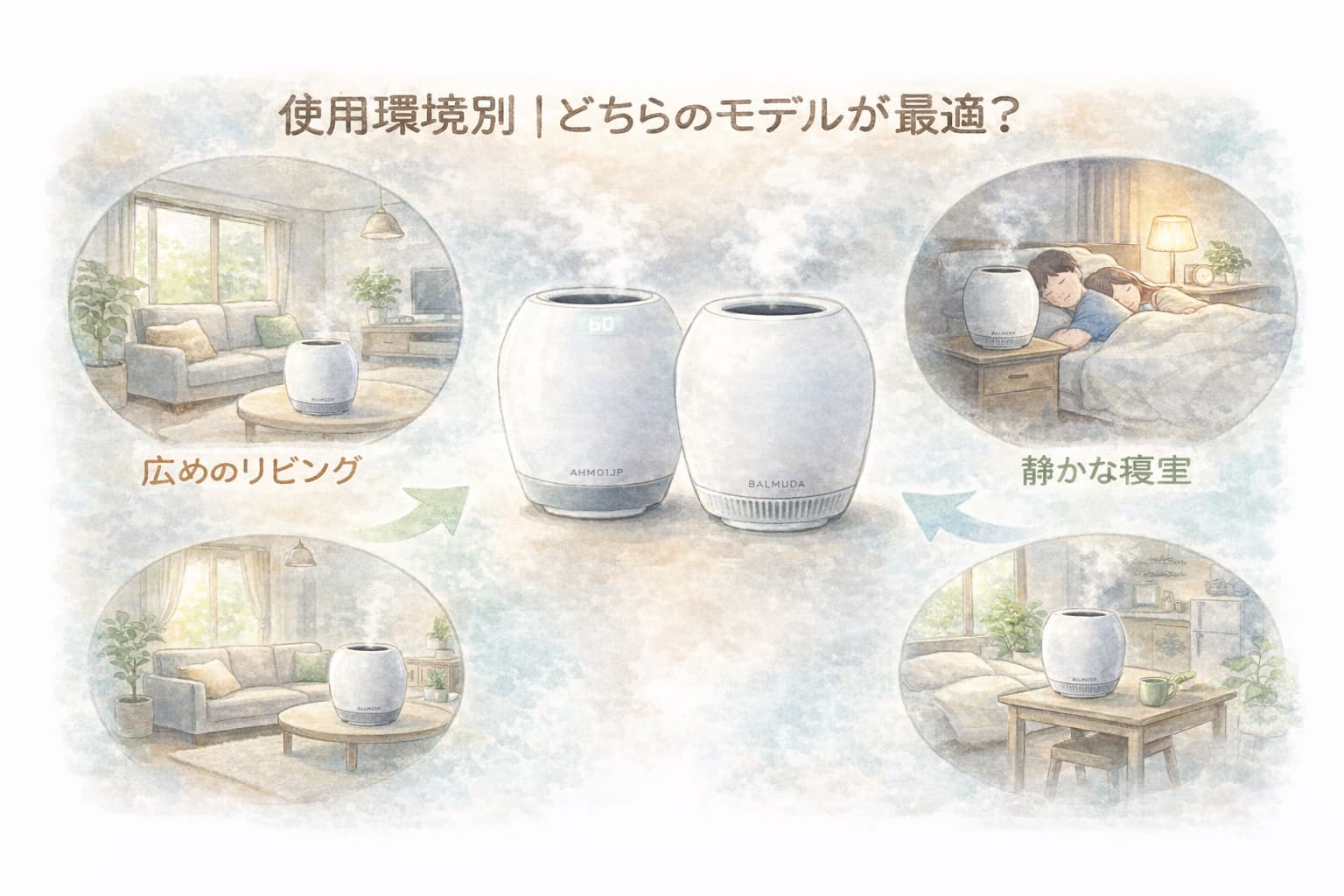 気化式特有の「自然なうるおい」は両機種に共通していますが、乾燥しがちな季節に長時間つけっぱなしにする場面や、家族が集まる大きめの空間で使う場面では、AHM01JPの方が一台でカバーできる範囲が広く、余裕を感じやすいでしょう。