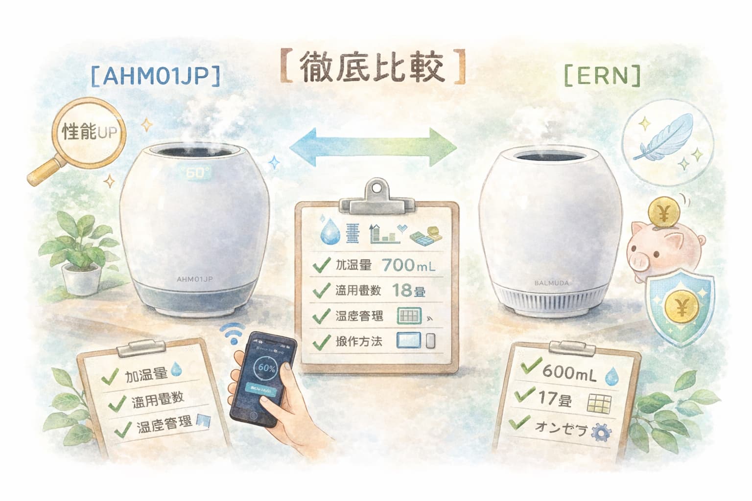 両モデルを比較すると、AHM01JPは「最新技術と使い心地の向上」を重視した進化系モデルであり、一方のERNは「十分な加湿性能とコスパ」を両立した定番モデルという立ち位置が明確になります。