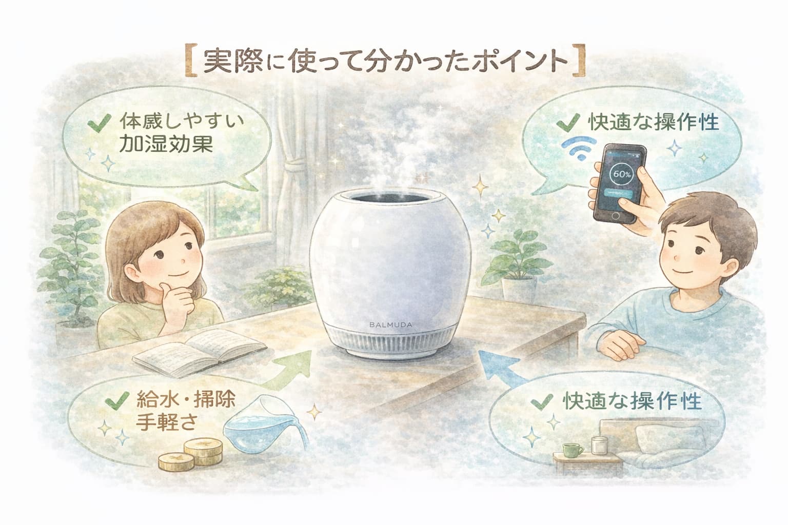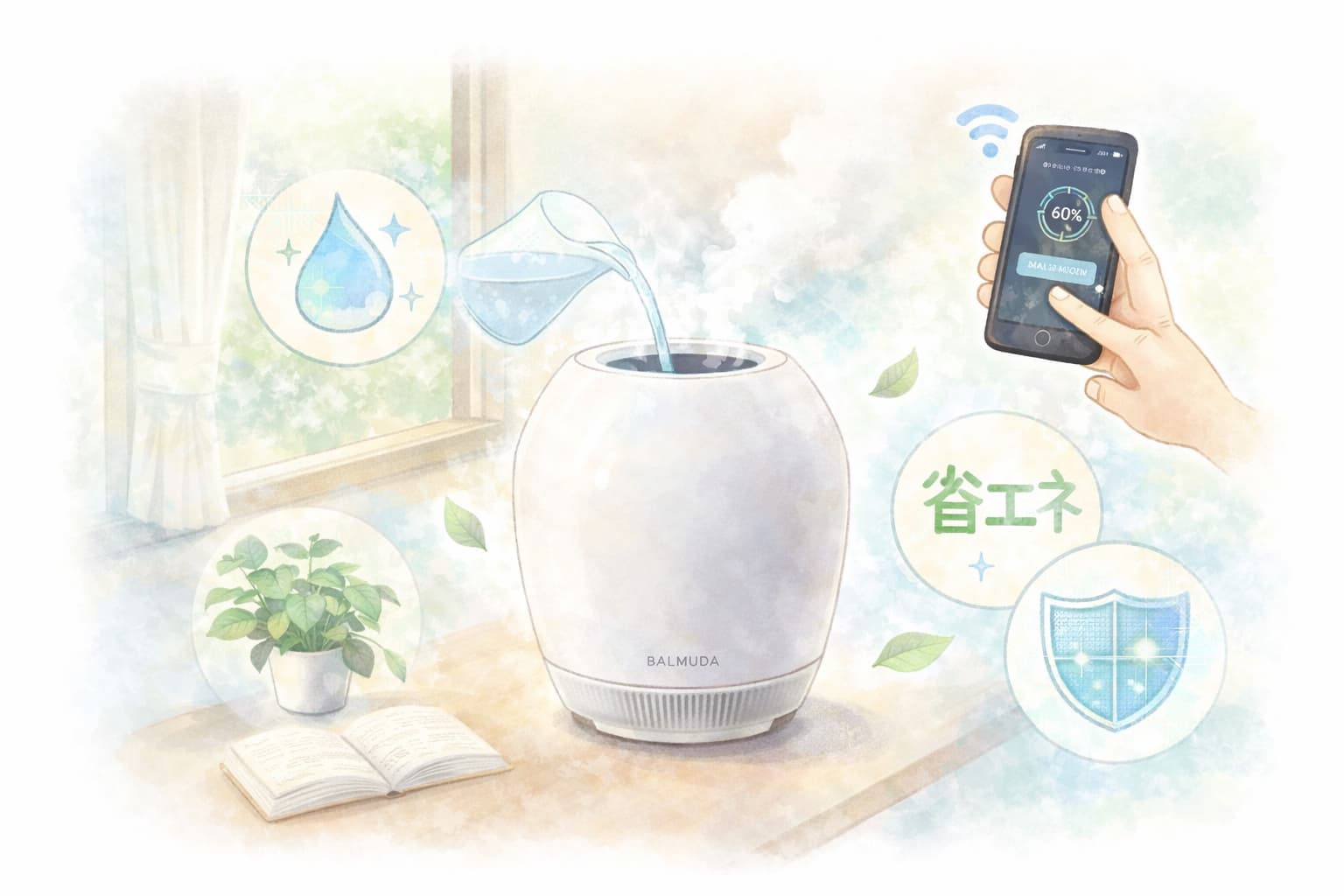 まず注目したいのは、BALMUDA Connectによるスマホ操作機能で、離れた場所から運転ON・OFFを切り替えたり、湿度設定を変更したりと、生活導線の中に自然と溶け込む利便性を持っています。