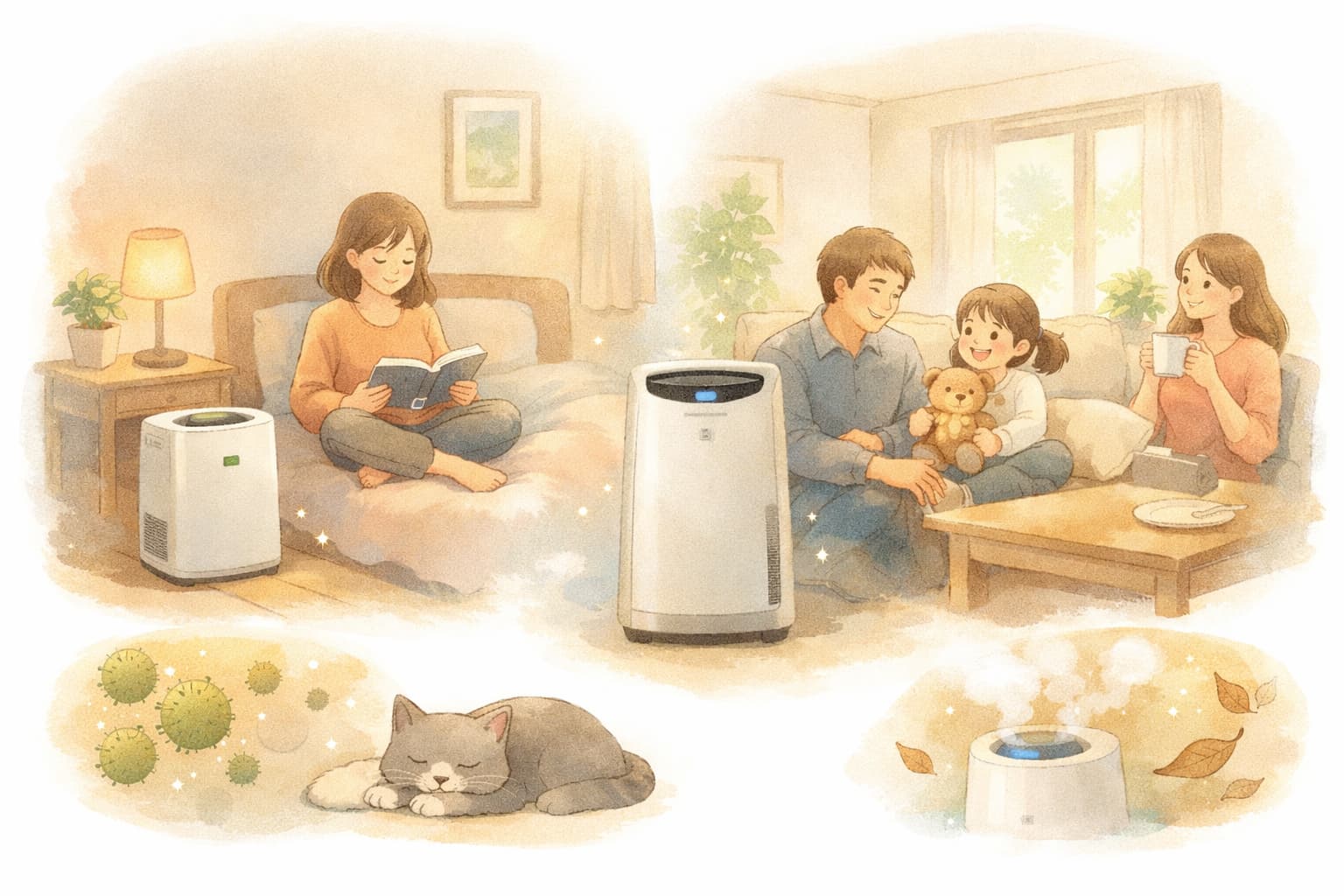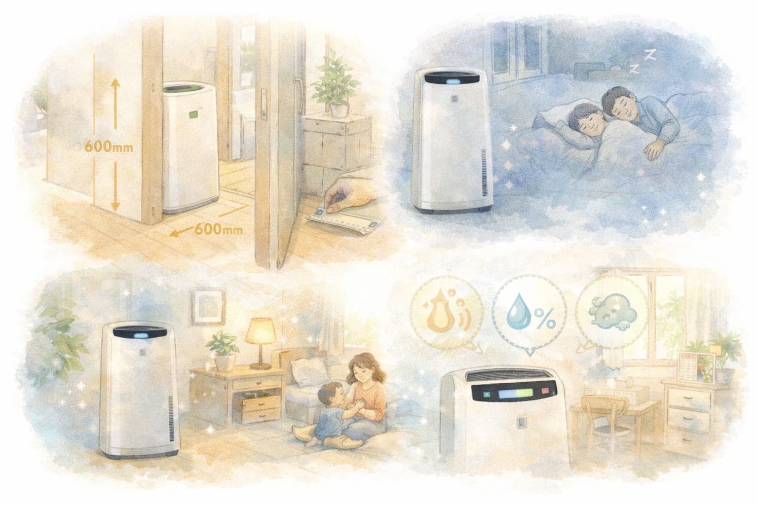 梅雨や夏場は加湿を控え、空気清浄や脱臭を中心に使うのが基本です。