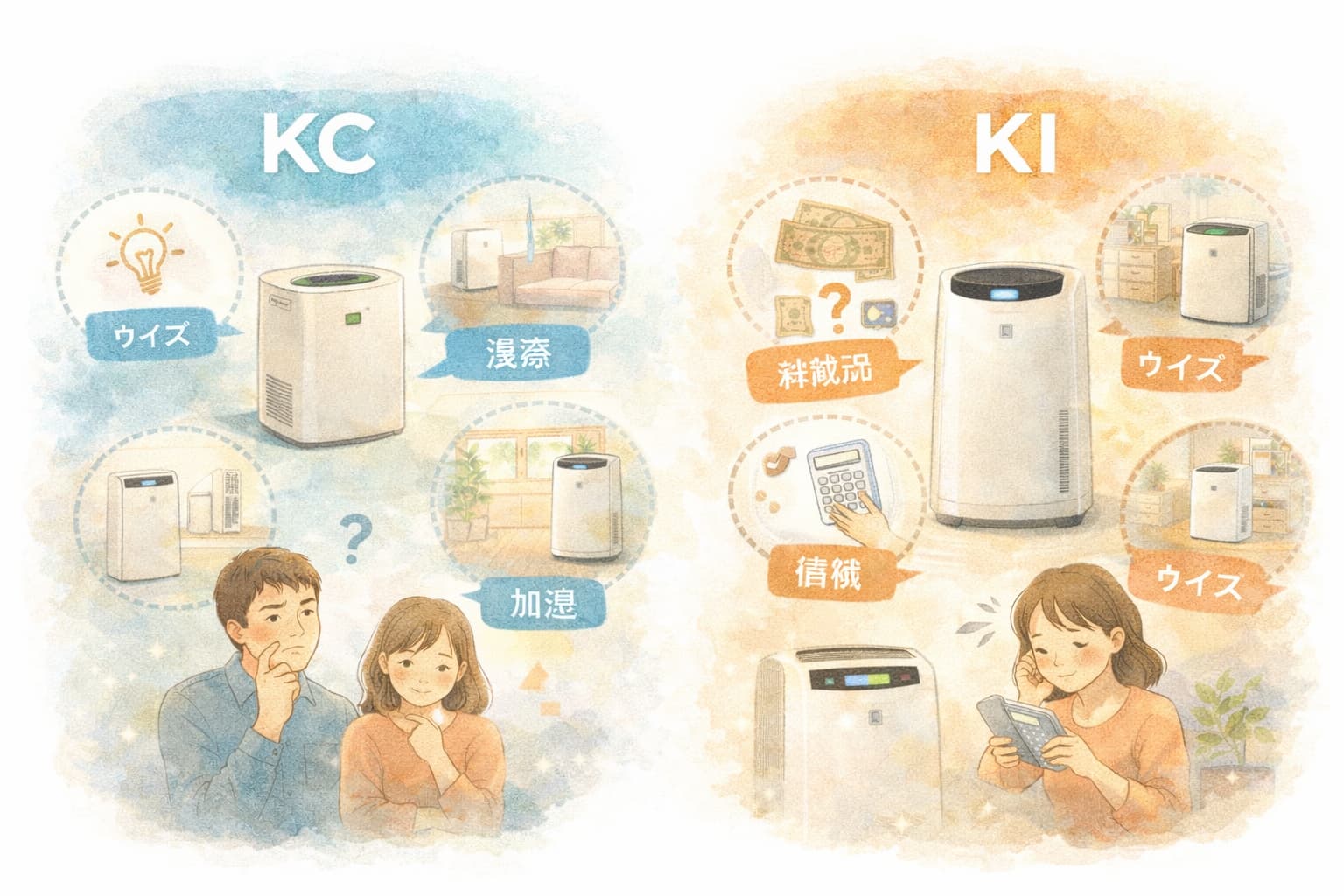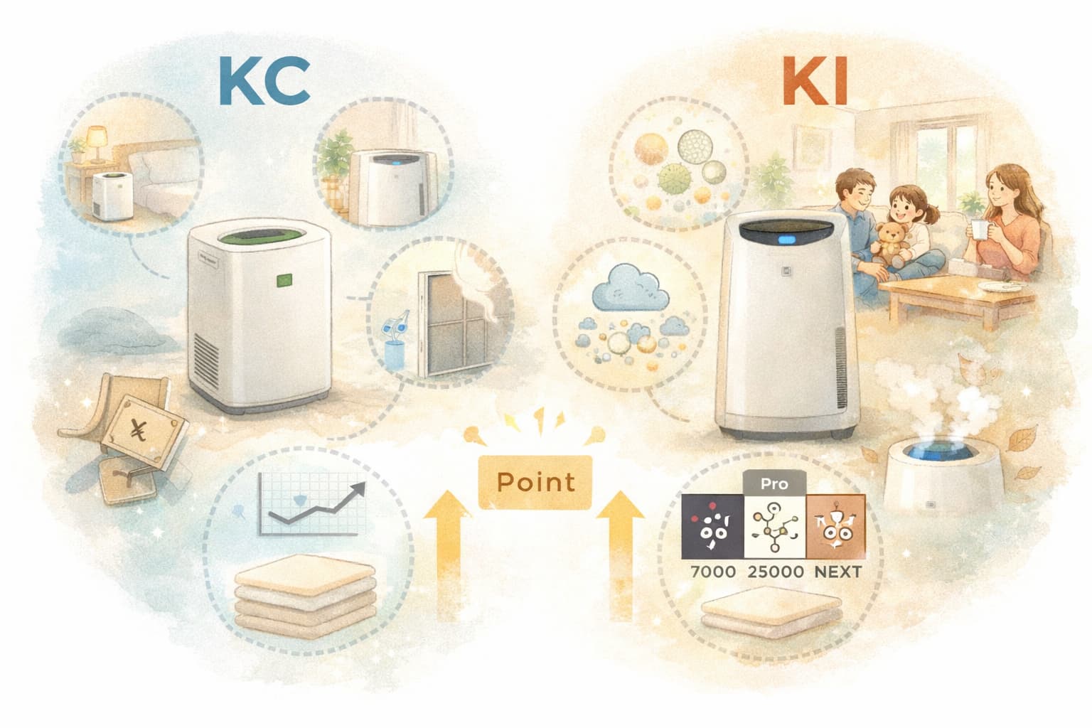 コスパ重視で個室や寝室に使うならKC、加湿力や快適性を重視してリビングで使うならKIという基本を押さえることで、選択はシンプルになります。