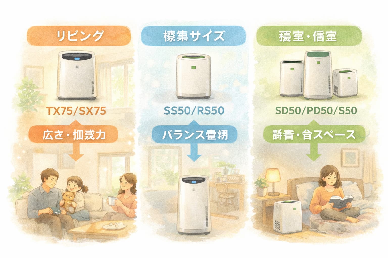 TX75・SX75は、リビングなど広めの空間で「空気清浄も加湿もパワー不足にしたくない」人に向いたクラスです。