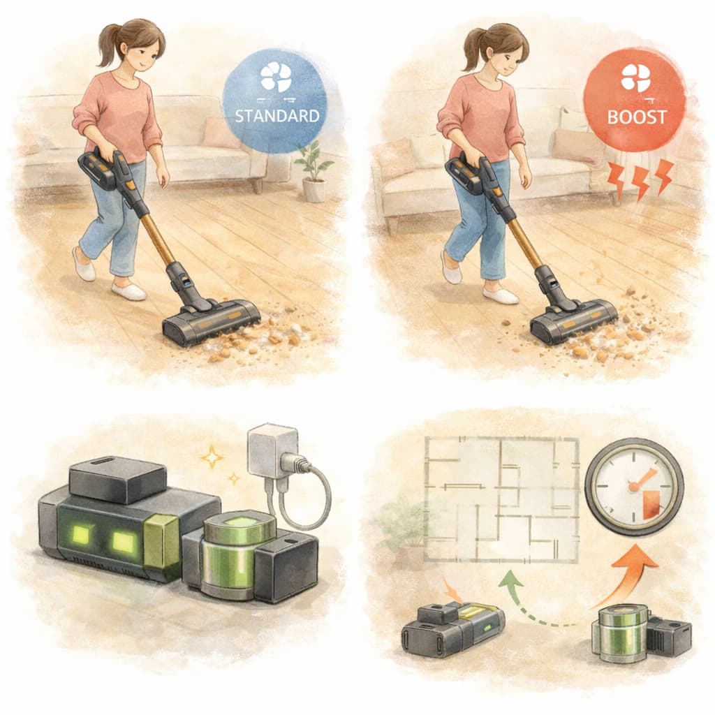 コードレス掃除機において、電池持ちは「スペック上の数値」よりも「どう使うか」で満足度が大きく左右されます。