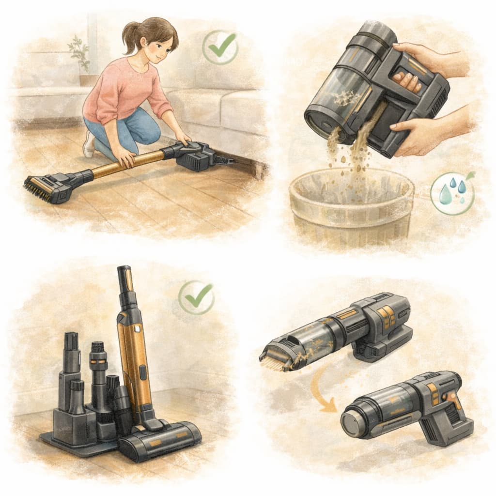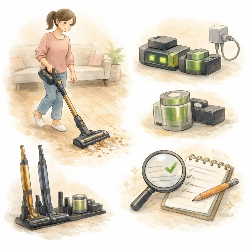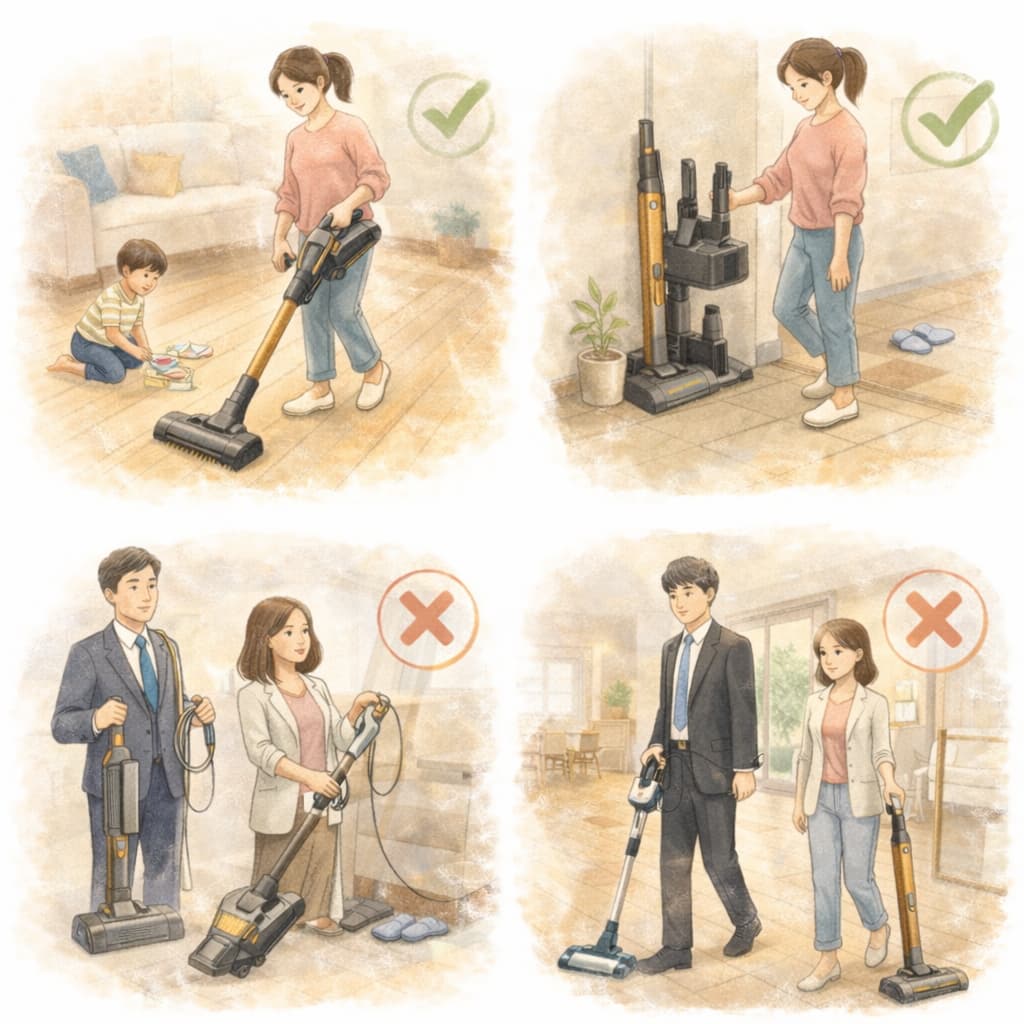 一方で、広い住まいを一度に強力なパワーで掃除したい人や、コード付き掃除機並みの吸引力を常に求める人には、使い方の工夫や別タイプの掃除機との併用が前提になります。