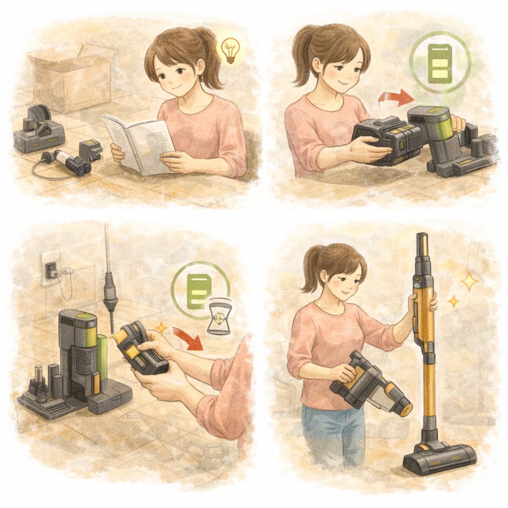 また、ダストカップやフィルターが正しくセットされているかを確認しておくと、初回使用時のトラブルを防ぎやすくなります。