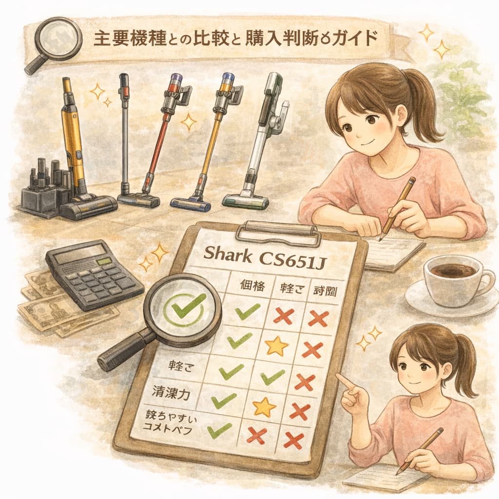 ここでは、Shark CS651J を軸に、同価格帯のコードレス掃除機と比較する際の視点を整理し、購入判断をしやすくします。