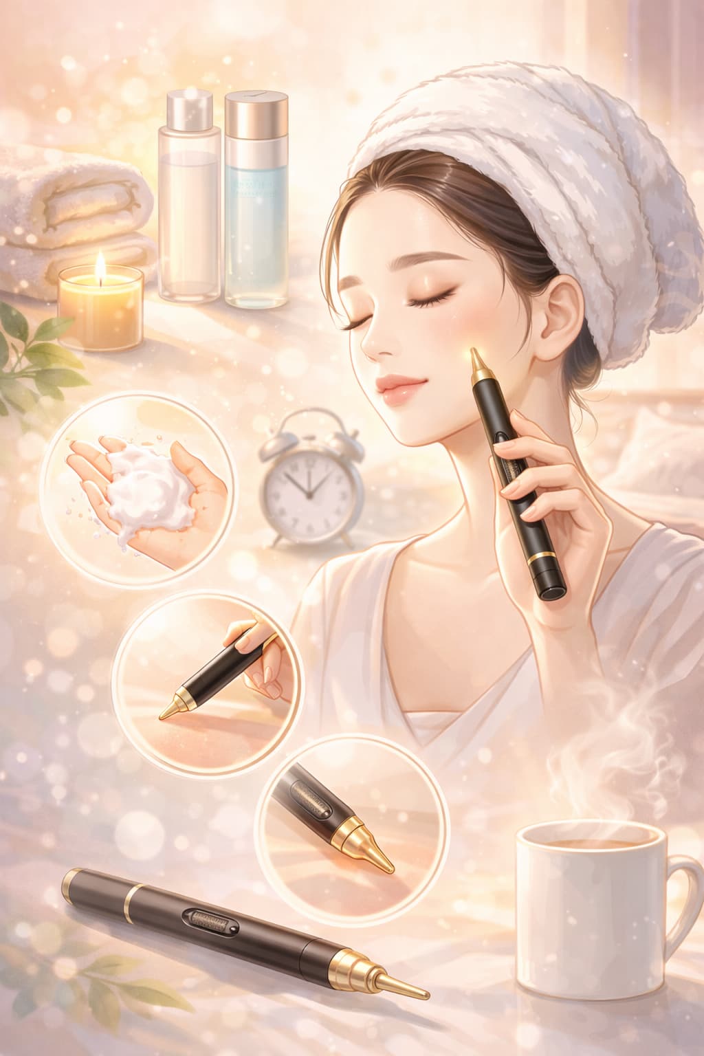 洗顔後やスキンケア後に1〜2分程度使う、朝の身支度や夜のリラックスタイムに軽く取り入れるなど、短時間で完結する使い方が向いています。