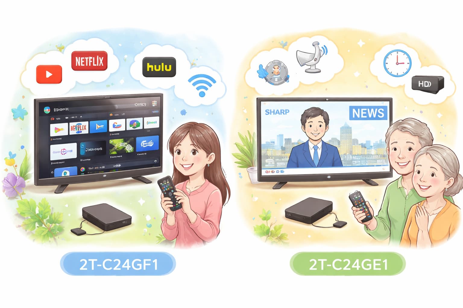 2T-C24GF1と2T-C24GE1の違いを一言でまとめると、スマート機能を重視するか、シンプルさを重視するかの違いです。