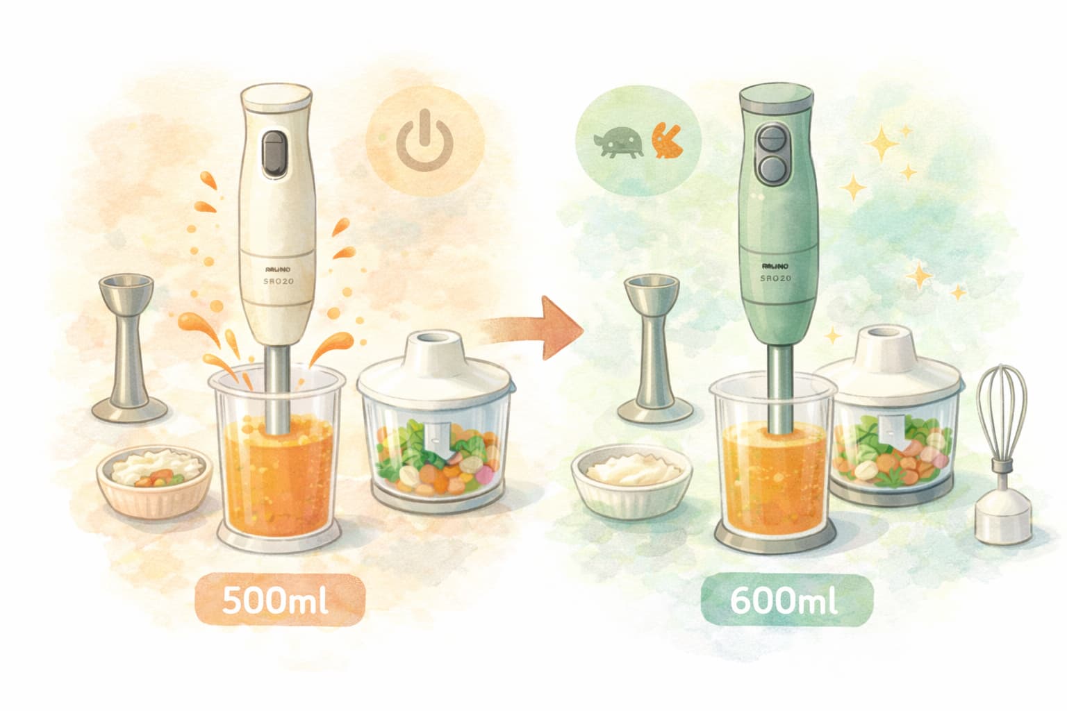 「つぶす・混ぜる・刻む・泡立てる」といった日常調理はどちらでも対応可能です。