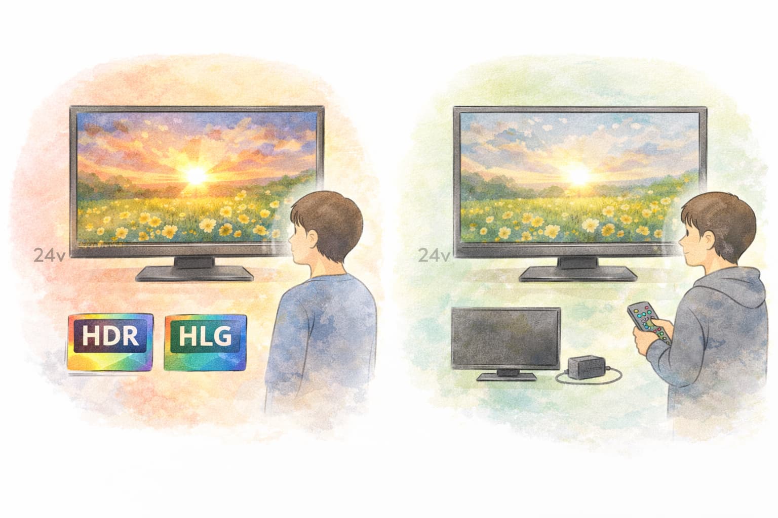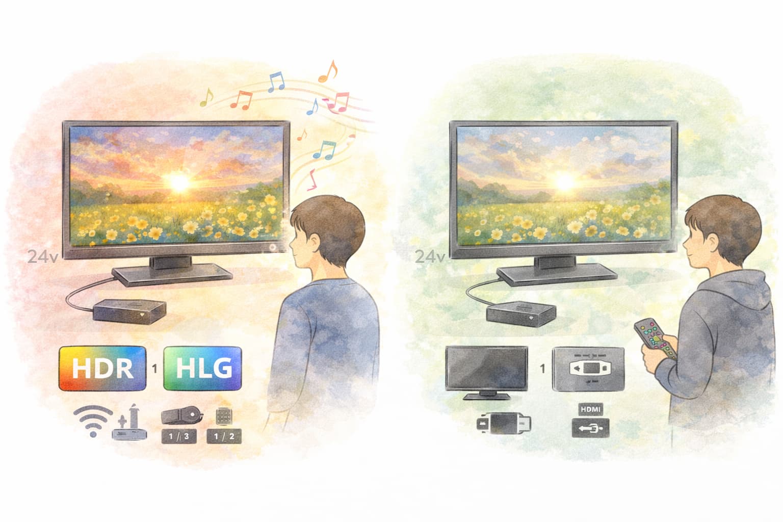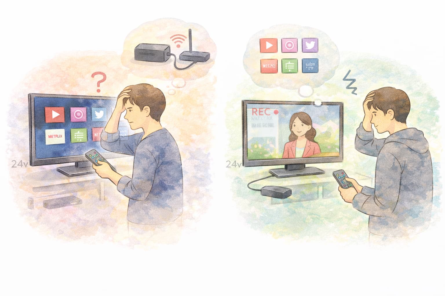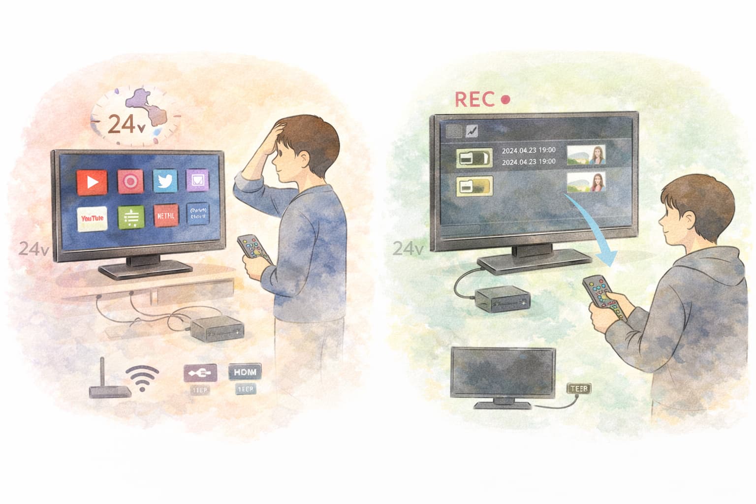 この記事では、「ネット動画をテレビ単体で見たい場合はどちらを選ぶべきか」「外付けHDDでの録画用途なら違いはあるのか」「そもそも24型テレビとしての使いどころはどう違うのか」といった、購入前によくある悩みを解消することを目的としています。