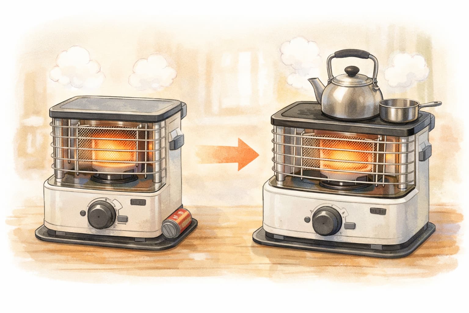 デカ暖3は、天板にやかんや小鍋を置き、湯沸かしや簡易的な加湿に活用できることを前提とした設計になっています。