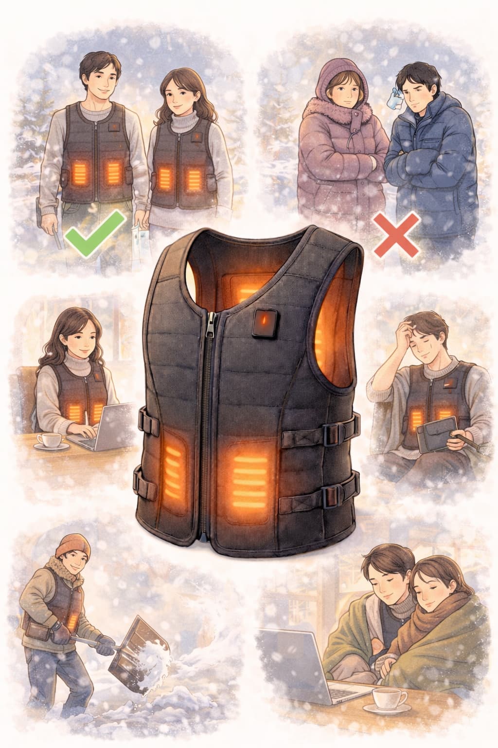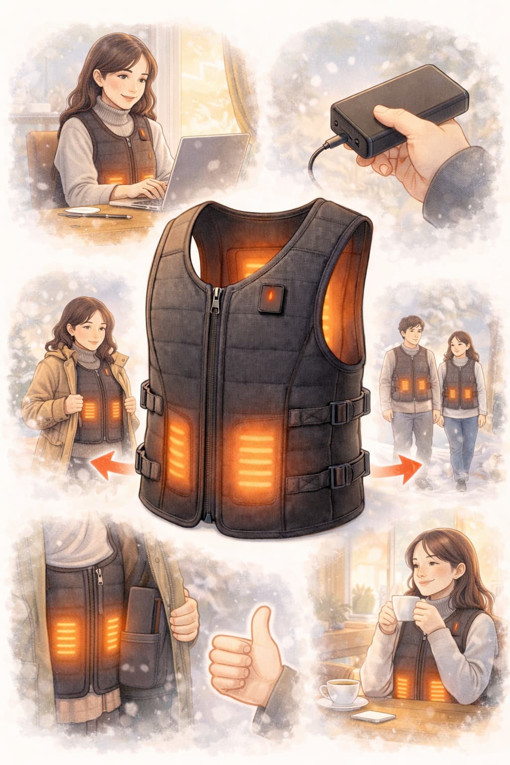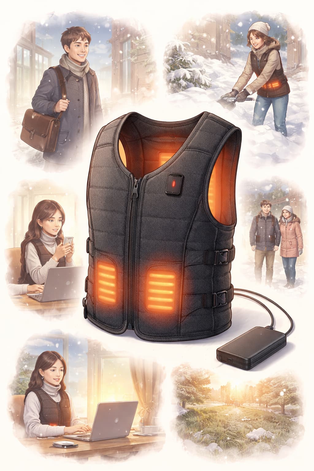 通勤や通学、屋外での軽作業、冷えやすい室内など、長時間じっとしている場面で寒さを和らげたい人には使いやすい電熱ベストです。