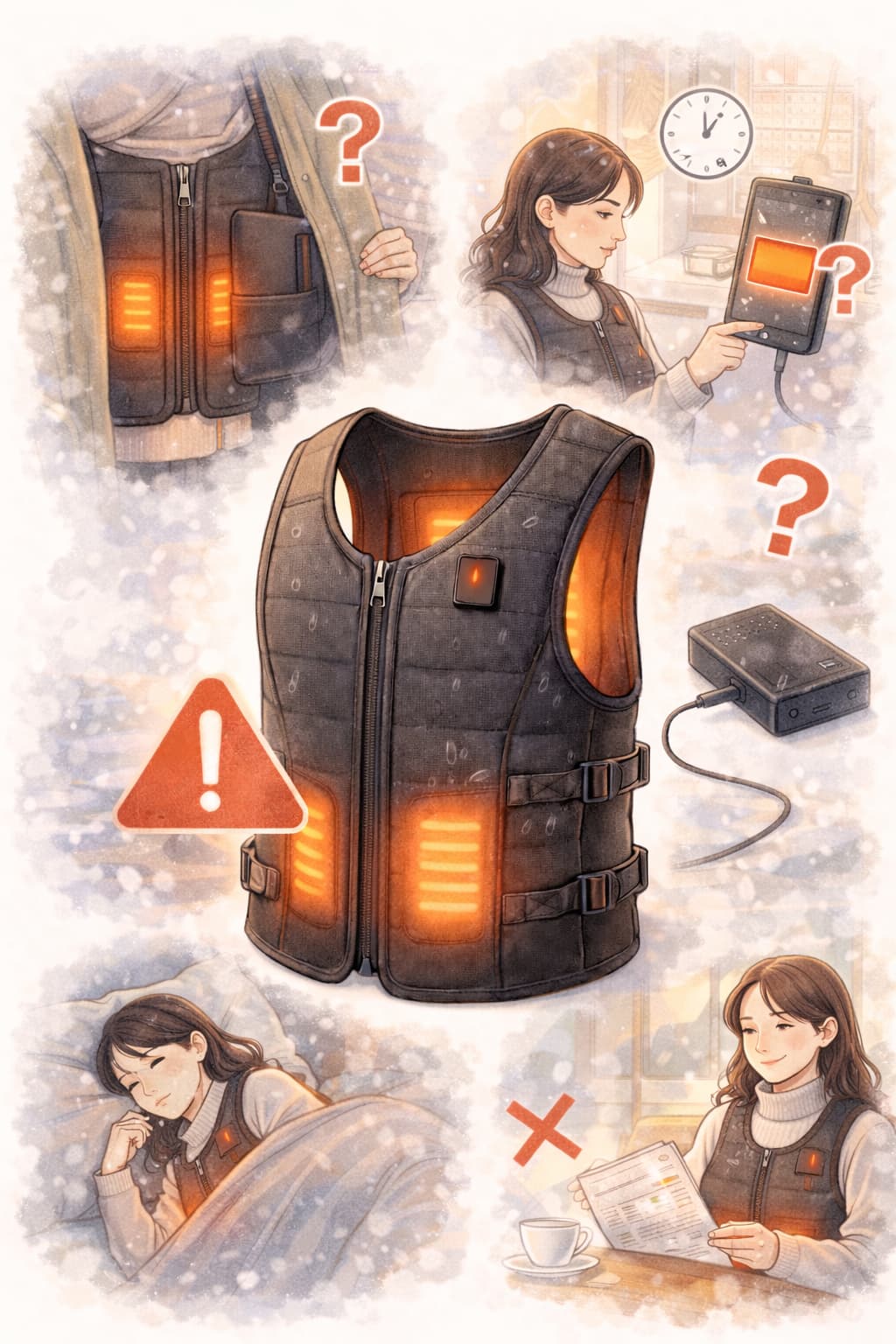 通常のベストと同じ感覚で扱うと故障の原因になる可能性があるため、メンテナンス面の注意点は事前に確認しておくと安心です。