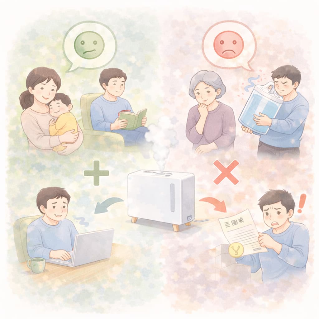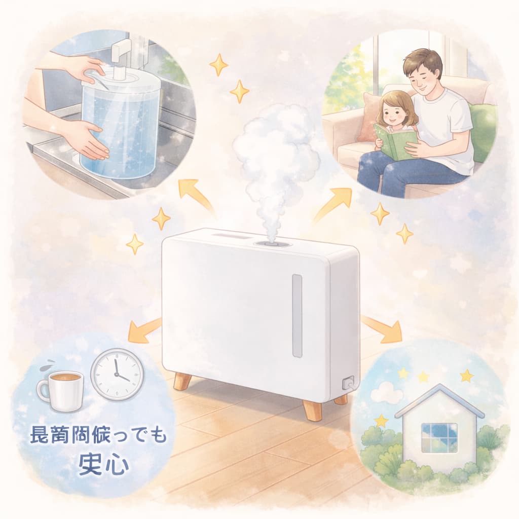 しかしその分、部屋全体を短時間で均一に加湿しやすいという明確な強みがあります。