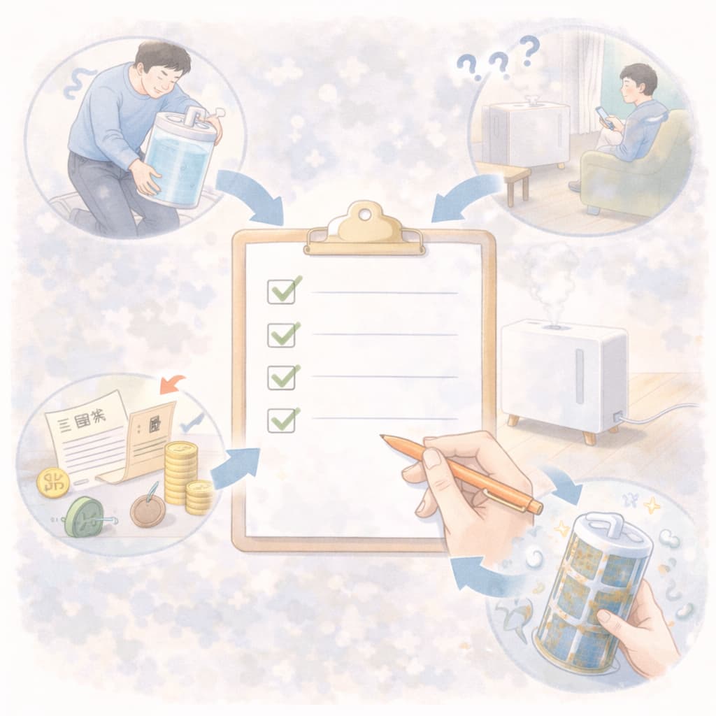 購入前に、部屋の広さ・天井高・設置スペース・給水動線・運転時間を確認しておくことで、後悔は避けやすくなります。