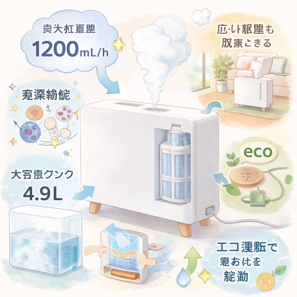 一般的な寝室用・個室用の加湿器とは異なり、広い部屋全体の湿度を短時間で引き上げることを重視した設計になっています。