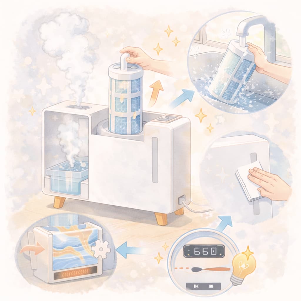 加湿効率の低下やニオイが気になり始めたら、洗浄や交換のサインと考えると判断しやすいです。