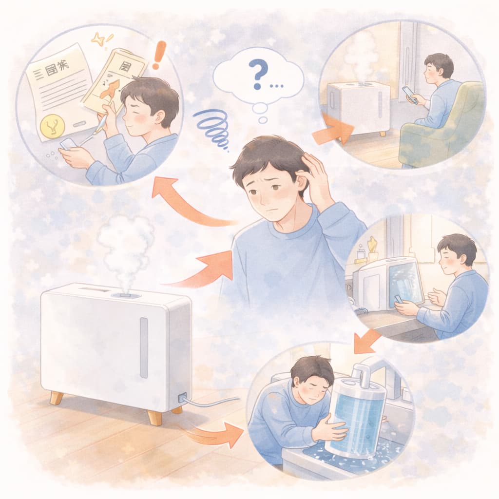 小型モデルでリビング加湿を試して「湿度が上がらない」「給水が頻繁で続かなかった」という経験がある人ほど、