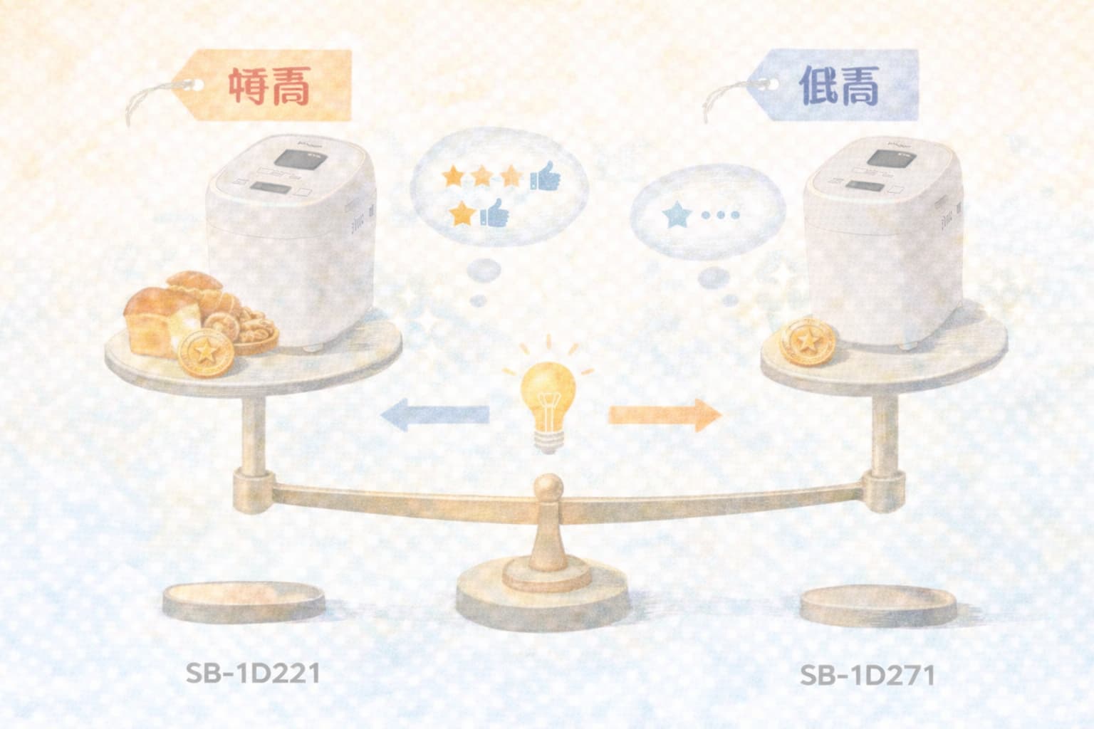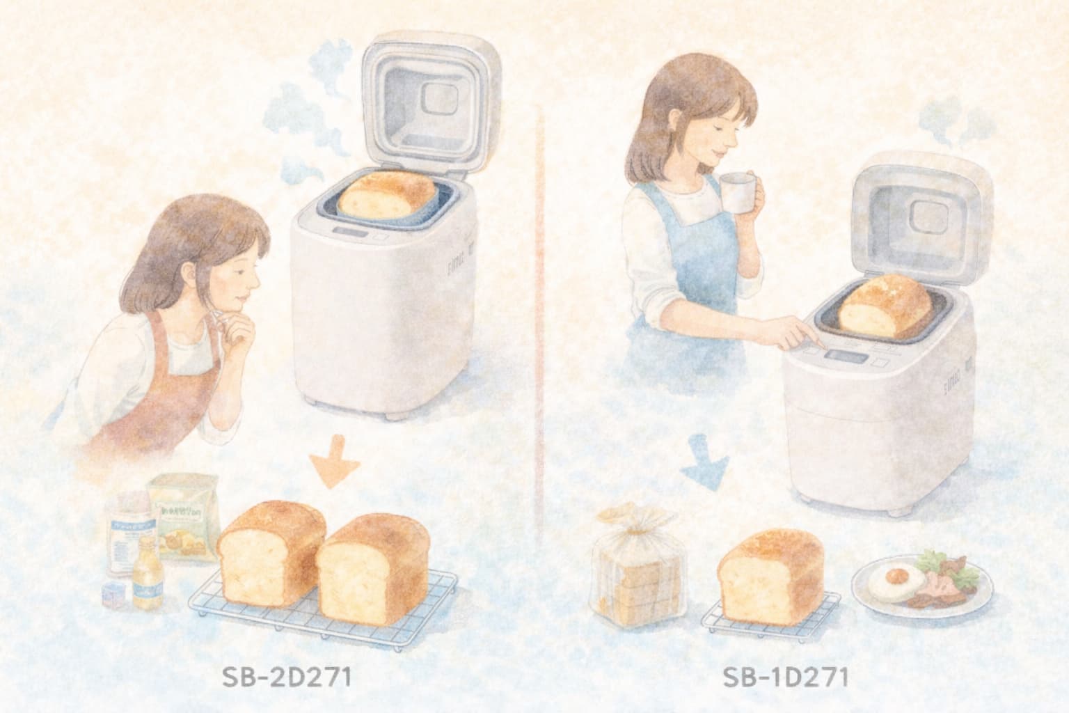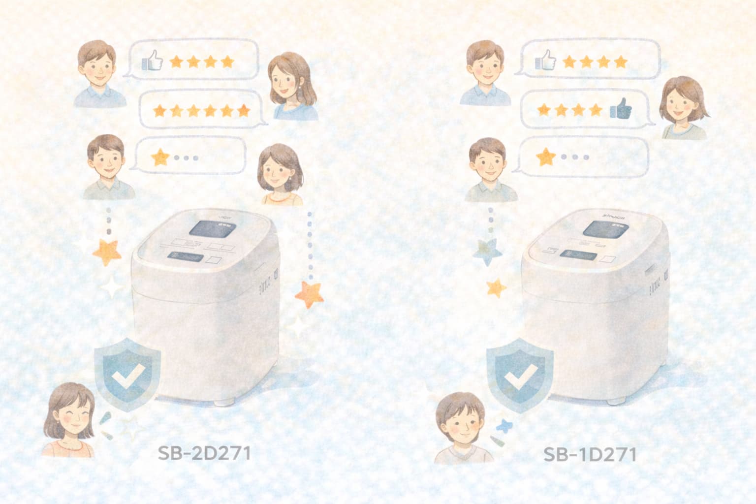 多機能を活かせる人はSB-2D271、シンプルにパン作りを楽しみたい人はSB-1D271を選んでいる傾向があり、自分の使い方と一致しているほど評価は高くなります。