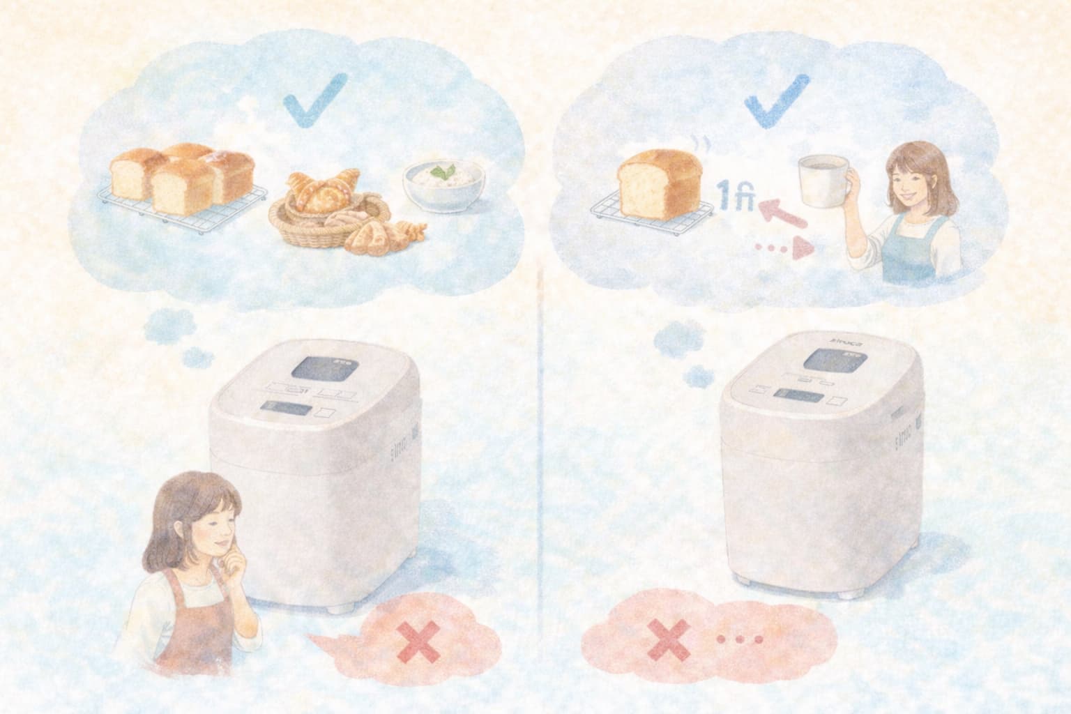 一方で、日常的に1斤しか焼かない人や、食パン以外はほとんど作らない人にとっては、機能や容量を持て余してしまう可能性があります。
