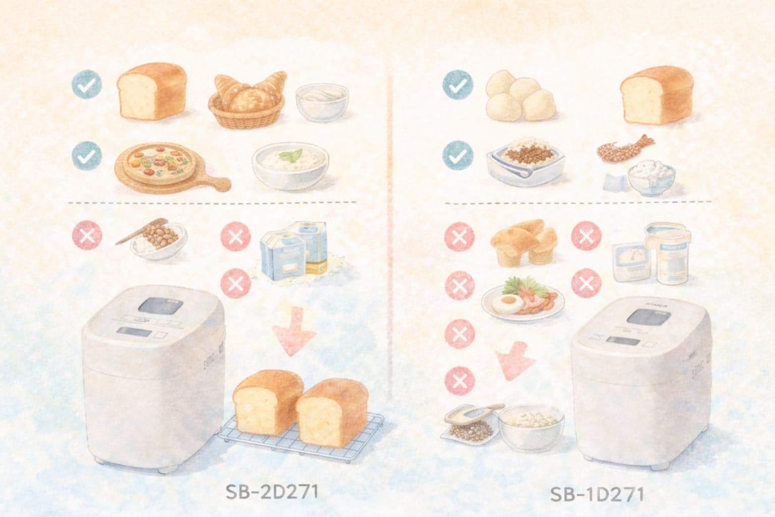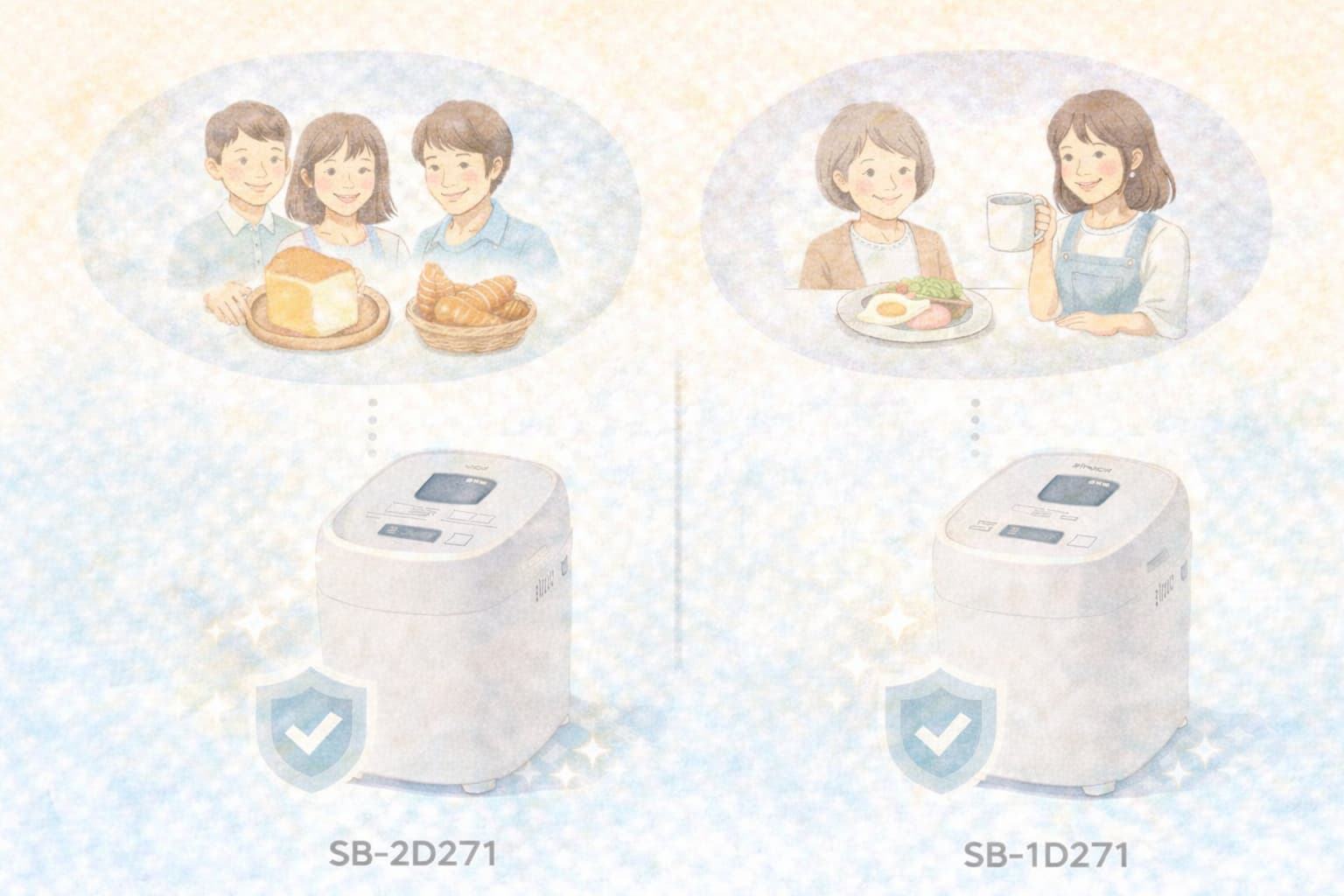 SB-2D271とSB-1D271はいずれも家庭で焼きたてパンを楽しむのに向いたモデルですが、対応できるパンのサイズやメニュー数に違いがあります。