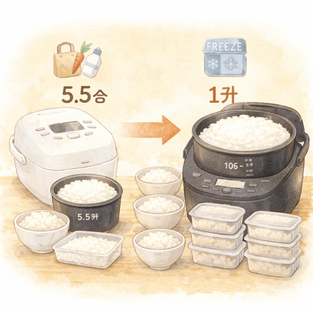 また、家族構成だけでなく、「毎日炊くのか」「まとめ炊きと冷凍を活用するのか」といった炊飯スタイルも重要な判断材料です。