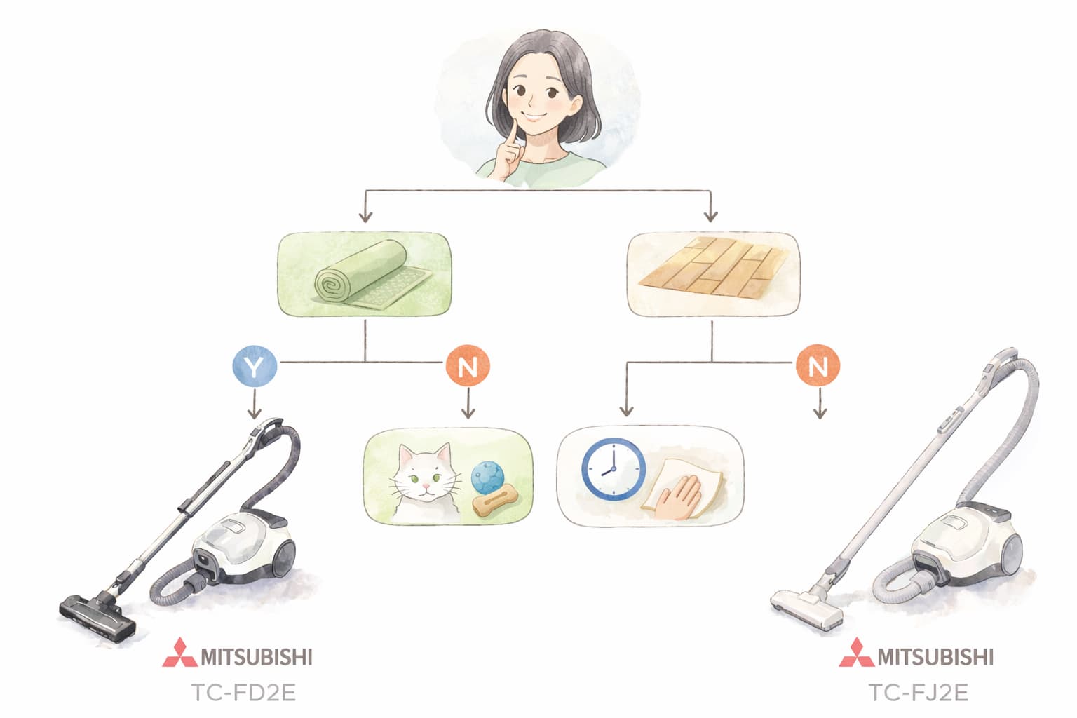 フローリング中心の家庭や一人暮らしではTC-FJ2Eを選ぶケースが多く、カーペット比率が高い家庭やペットを飼っている家庭ではTC-FD2Eが選ばれる傾向があります。