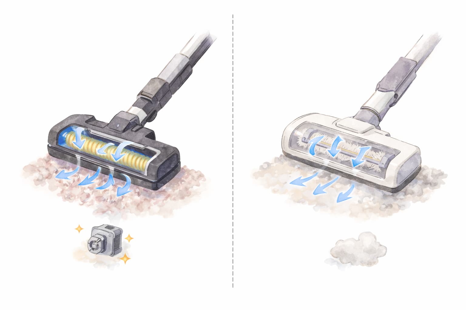 自走式パワーブラシとタービンブラシの違いは、「ブラシを回転させる仕組み」と「回転力の安定性」にあります。