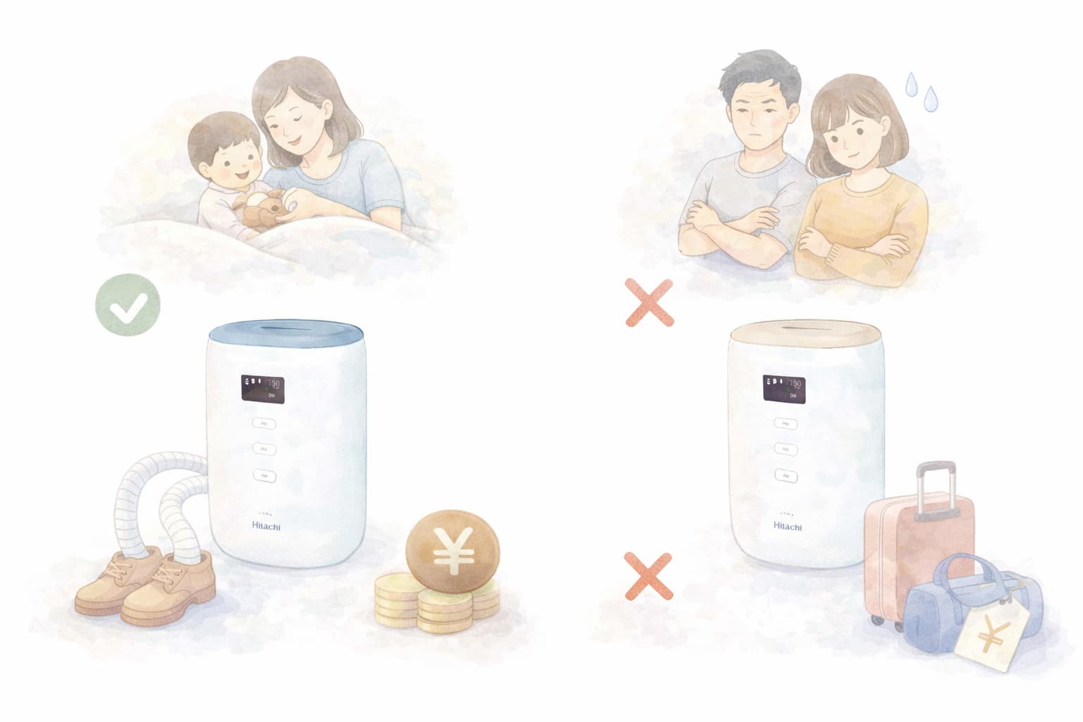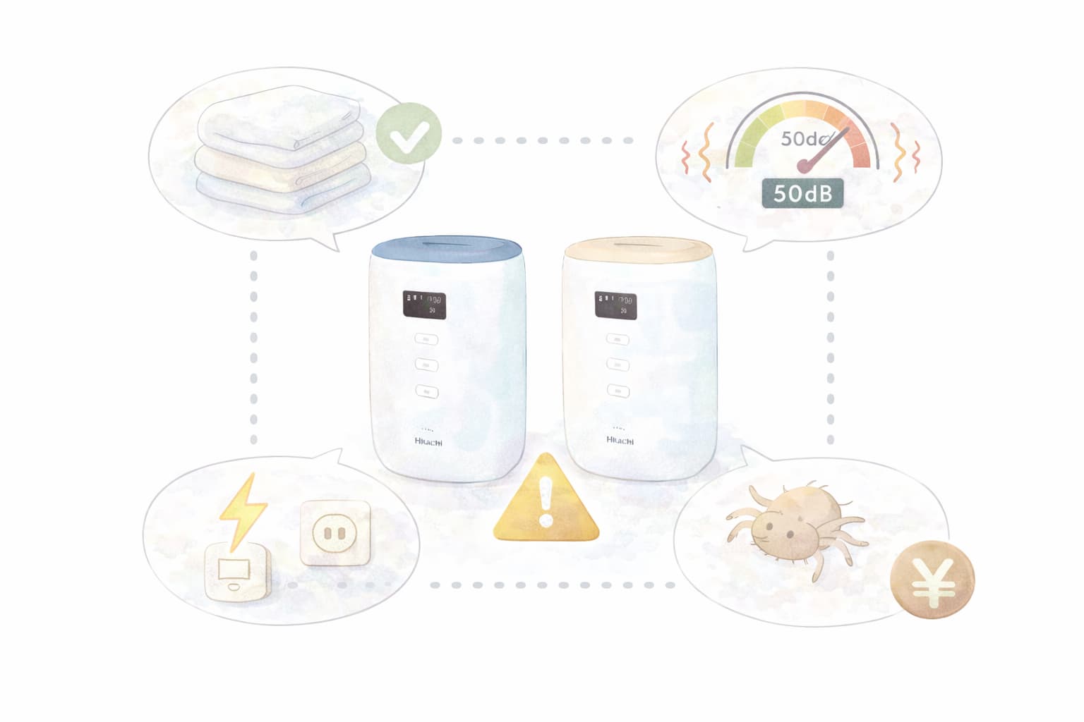 基本的な乾燥力や消費電力はほぼ同等で、日常的な暖めや湿気対策、ダニ対策といった用途ではどちらを選んでも大きな不満は出にくいでしょう。