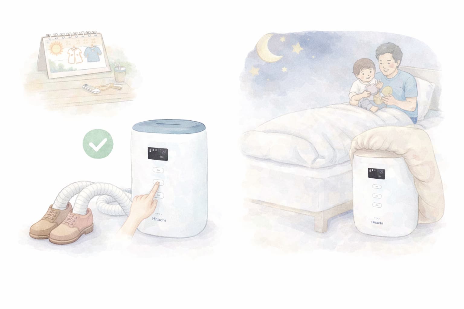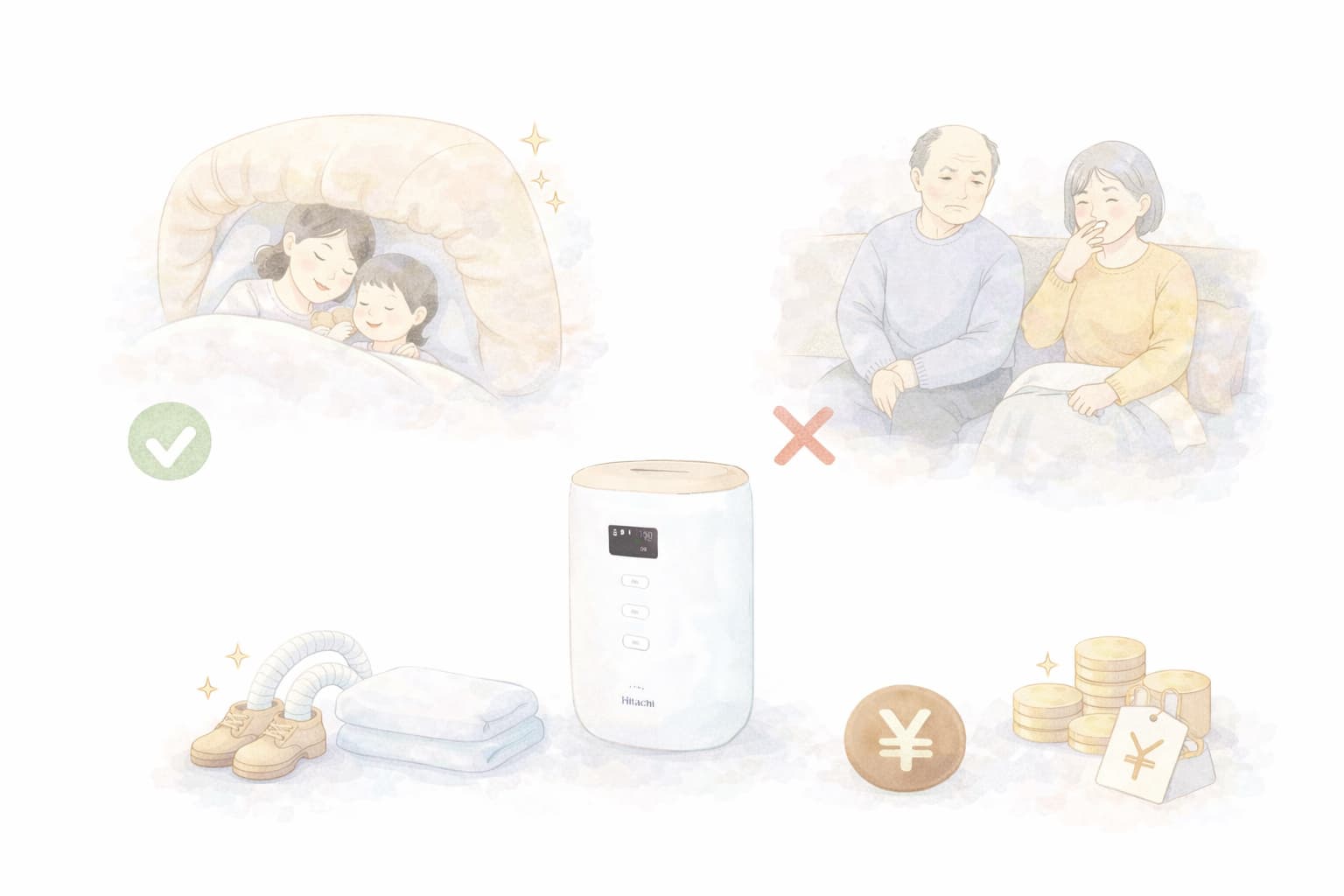 一方で、冬場に毎日のように使用する、ベッド環境でホースの取り回しを重視したい、長期的な満足度を優先したいといった場合はHFK-CV1Bを選ぶことで納得感が得やすくなります。