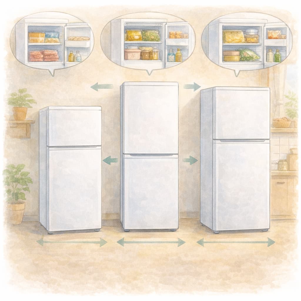 100L前後の小型冷蔵庫はコンパクトで設置しやすいですが、冷凍室が20〜30L程度と狭く、冷凍食品や肉・魚の保存が限られます。