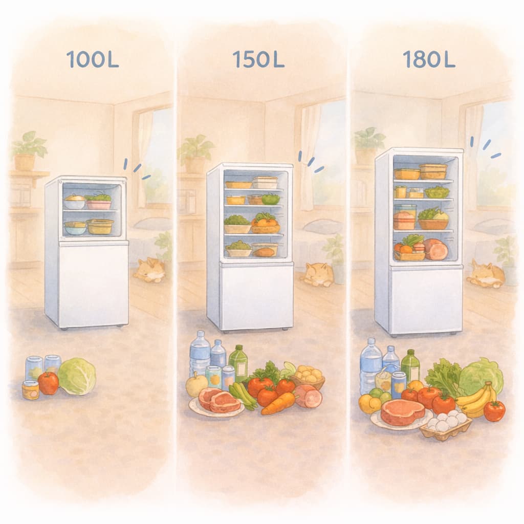 一人暮らし向け冷蔵庫は100L〜200Lまで幅広く存在しますが、実際に生活を始めてみると「思ったより冷凍室が足りない」「作り置きが入らない」という不満が出やすいものです。