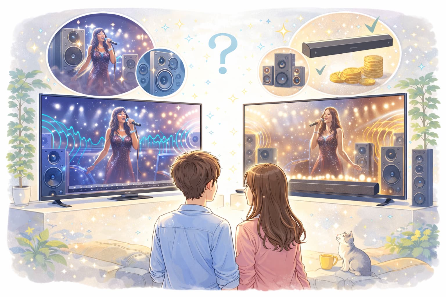 ここでは内蔵スピーカーの差を「どんな人が得をするか」という視点で整理し、サウンドバーを使う場合の考え方も含めて判断しやすくします。
