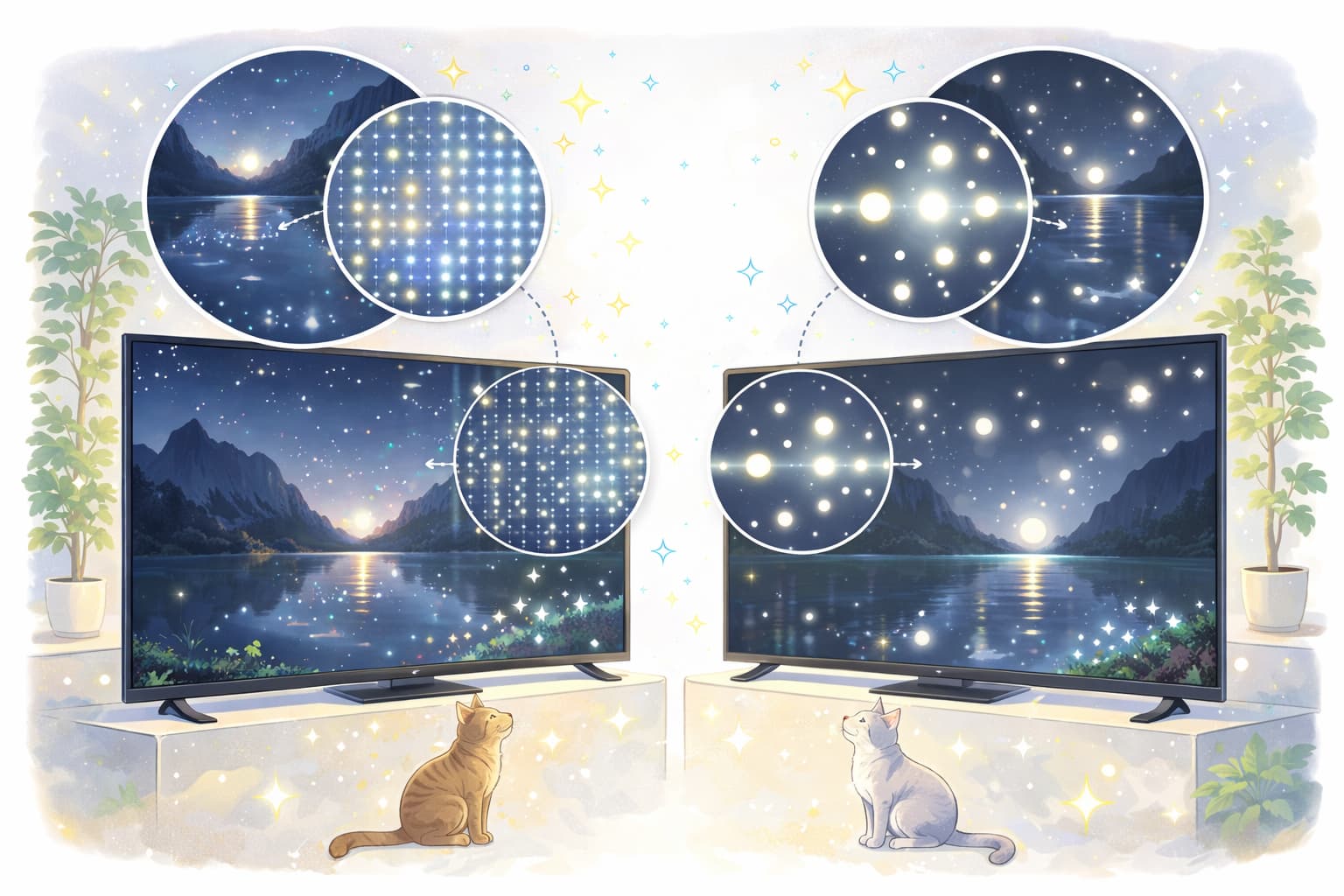 Mini LEDは高輝度に強く、明るい部屋でも映像が映えやすい一方で、暗部の表現は制御の精度に左右されます。