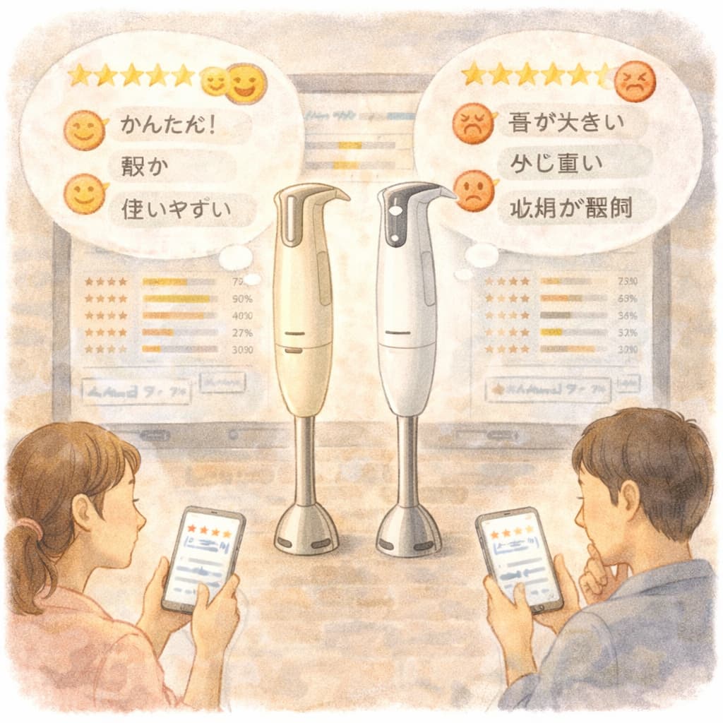 とくにハンドブレンダーは、使い方の差が評価に直結するため、他人の評価をそのまま当てはめるのは危険です。