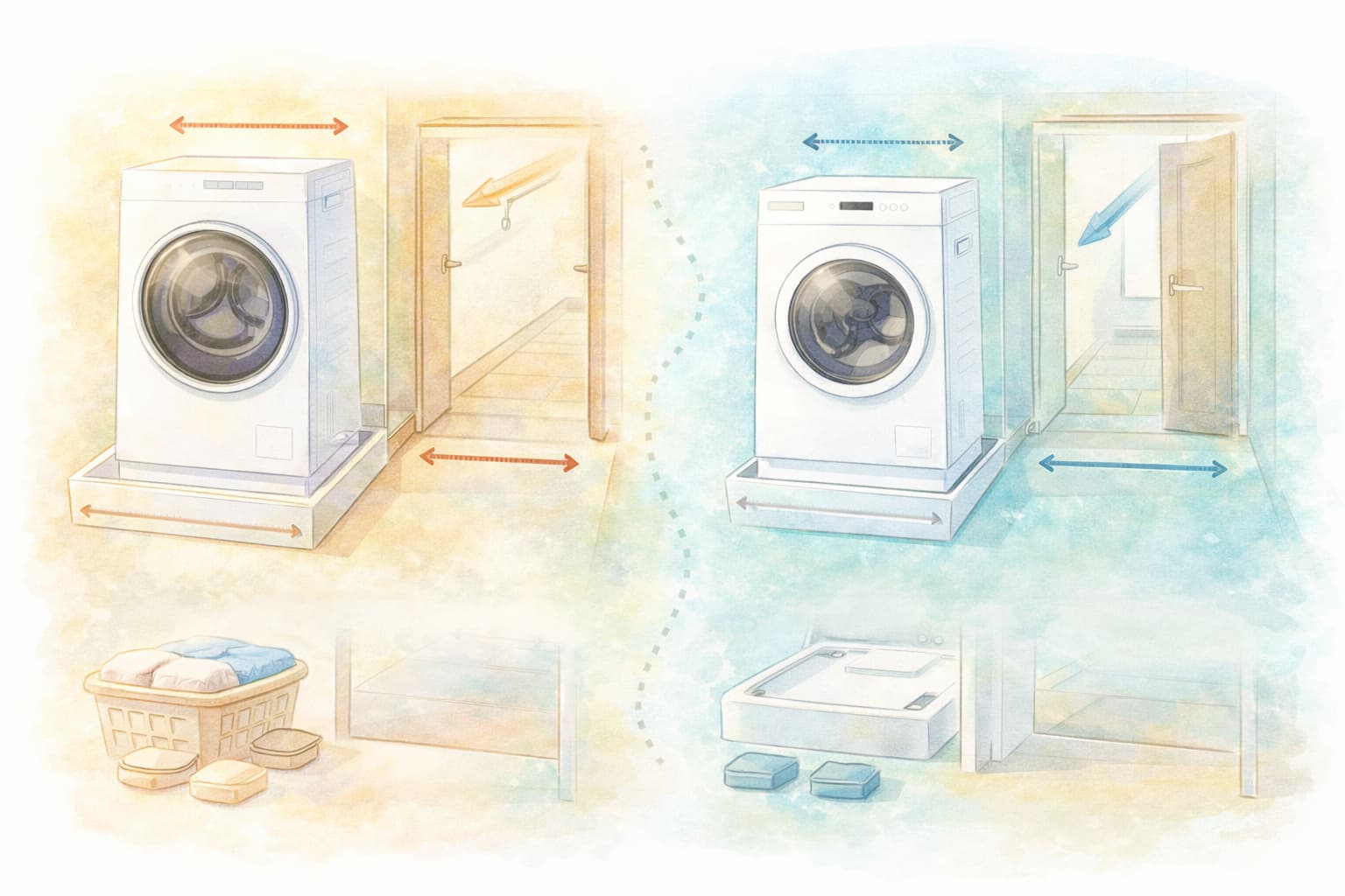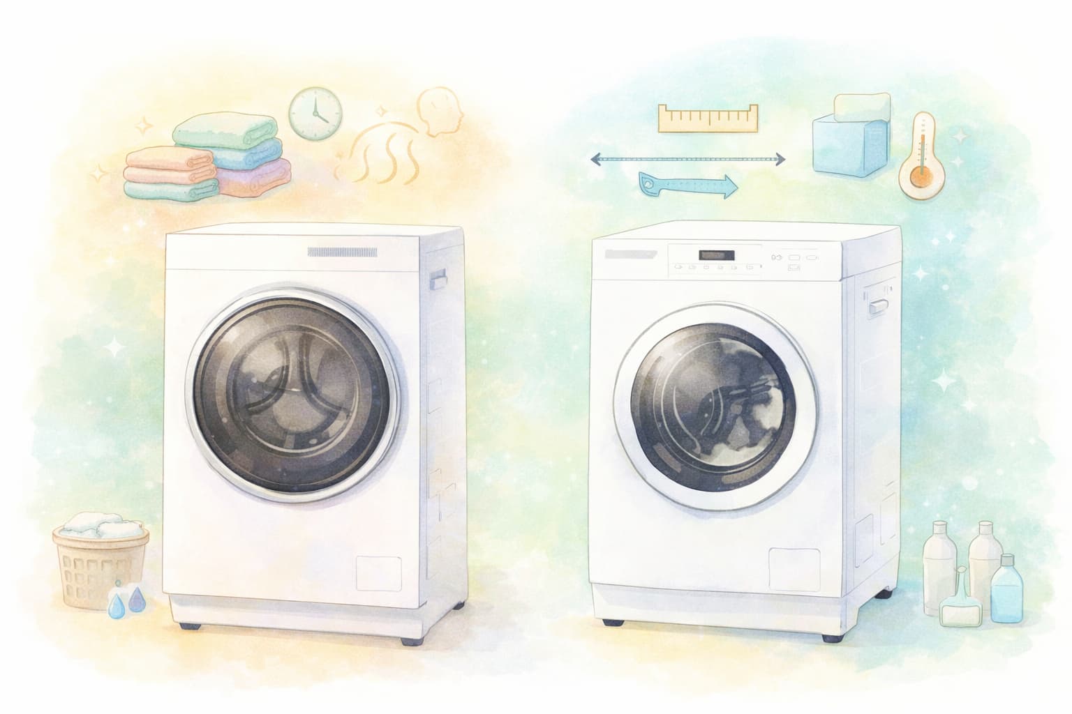 購入前に、防水パン内寸、排水位置、前面スペース、搬入経路の最狭部を測り、設置の不安を潰したうえで、乾燥の頻度と衣類の傾向に合う方を選ぶと、後悔が最も減ります。