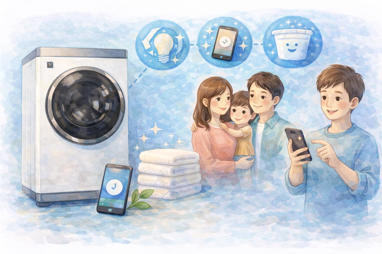スマホ連携に対応した洗濯機は、運転状況の把握や通知機能など、忙しい毎日の中で役立つ場面があります。