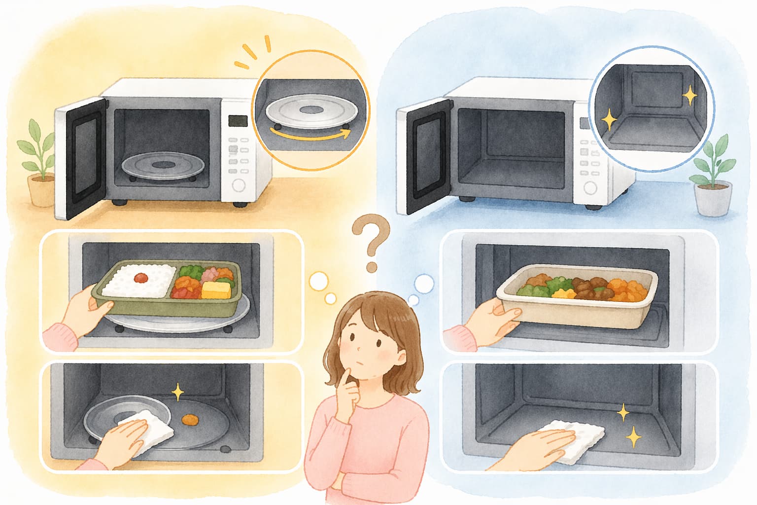 | 特徴 | ターンテーブル式でシンプルに使いやすい。価格重視で選びやすいタイプ。 | フラット庫内で大きめのお弁当も置きやすく、掃除もしやすいタイプ。 |