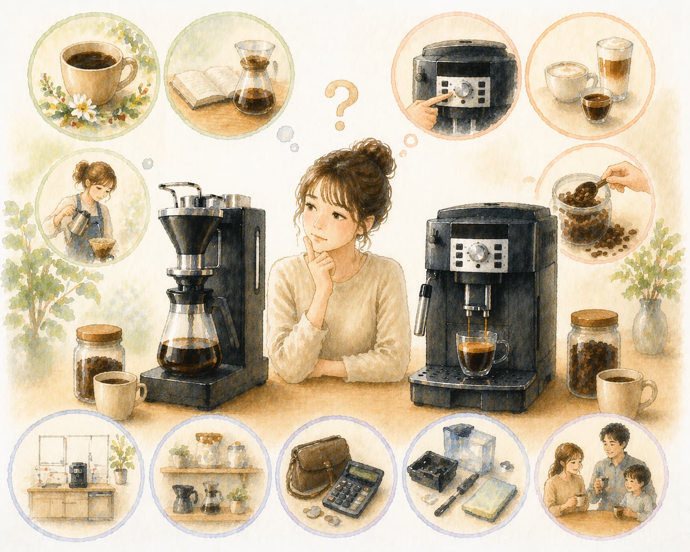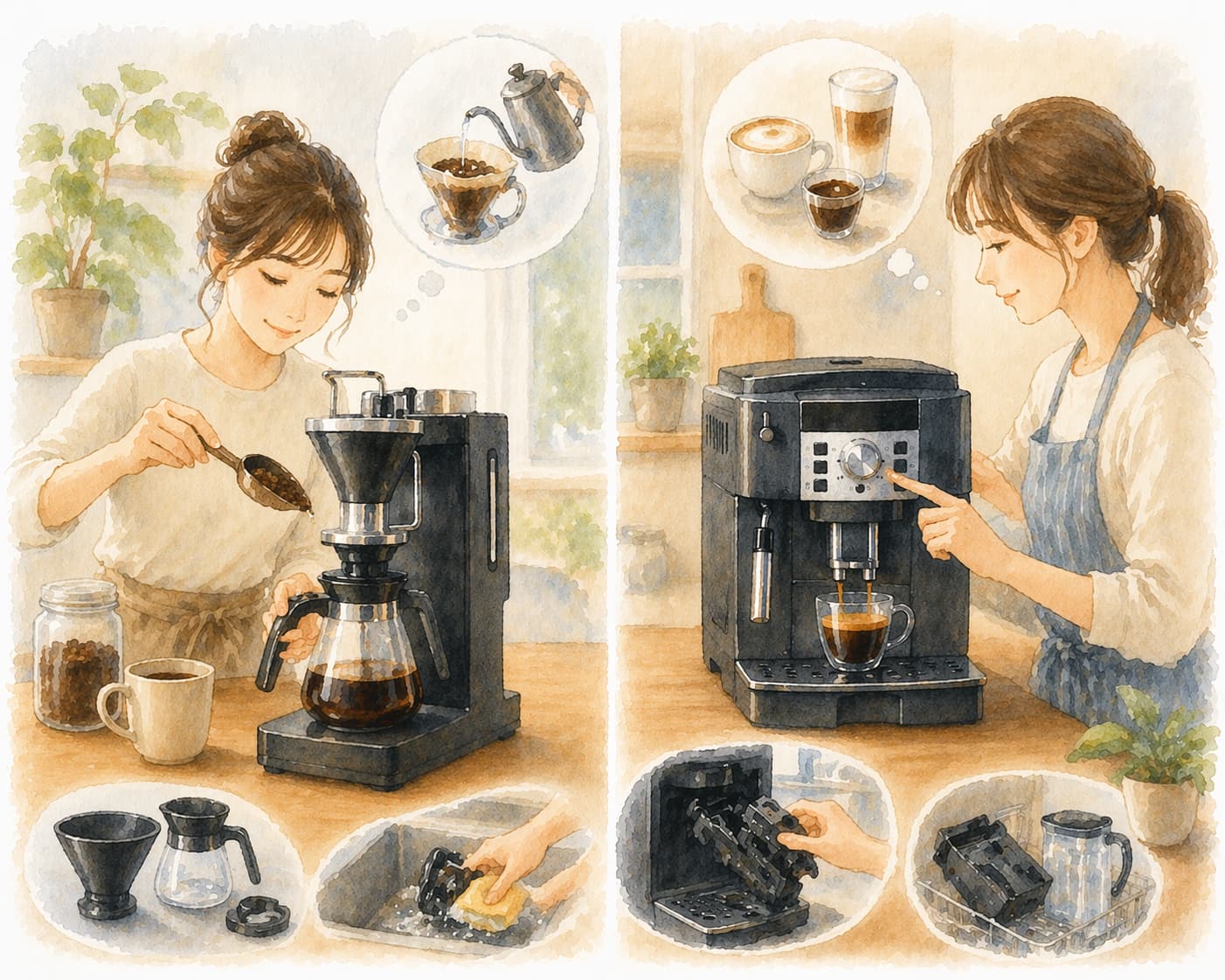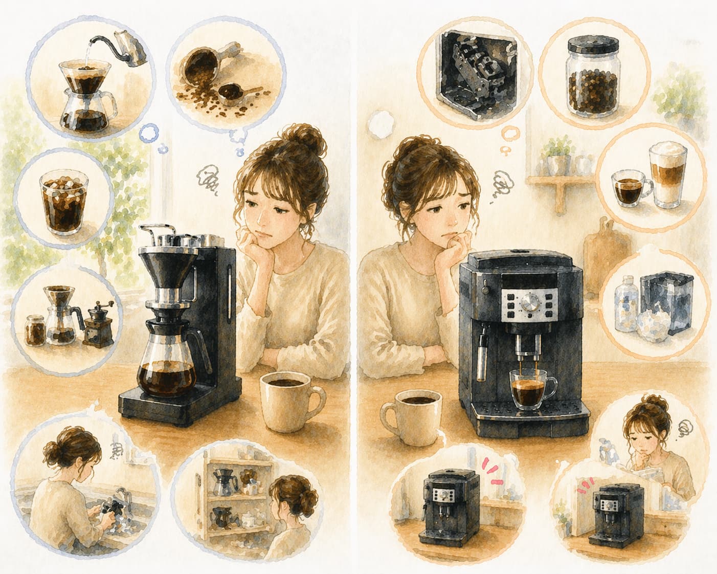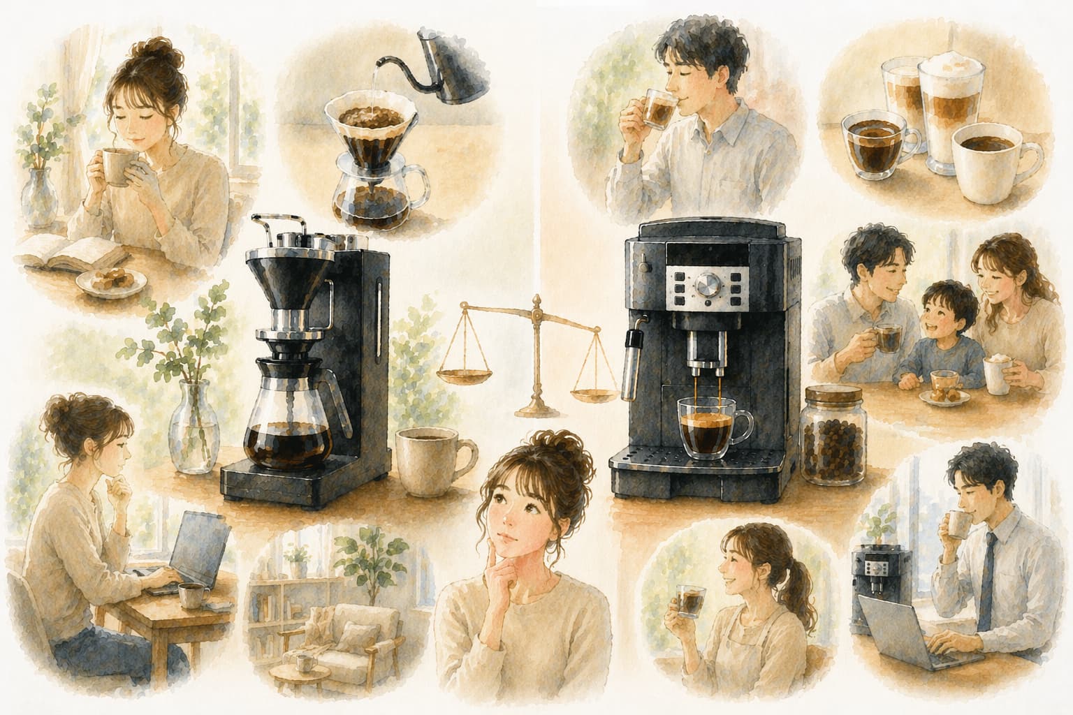 どちらが優れているかではなく、ドリップ派として楽しみたいのか、全自動派として便利に続けたいのかで選ぶことが、満足しやすい近道になります。