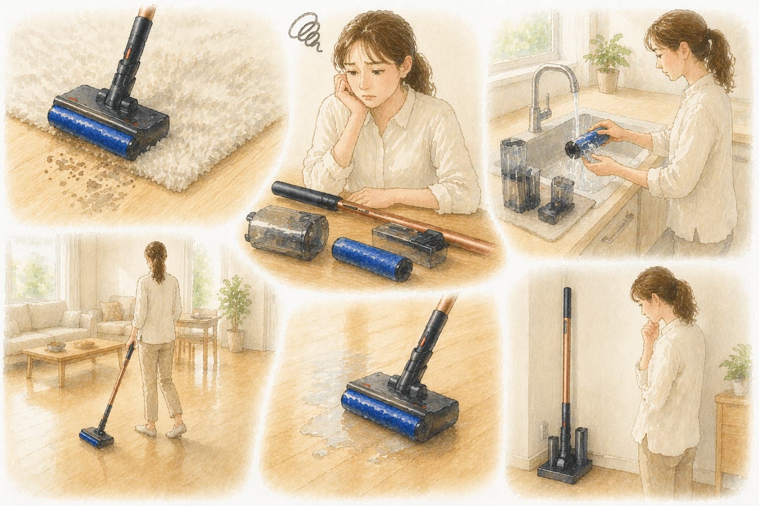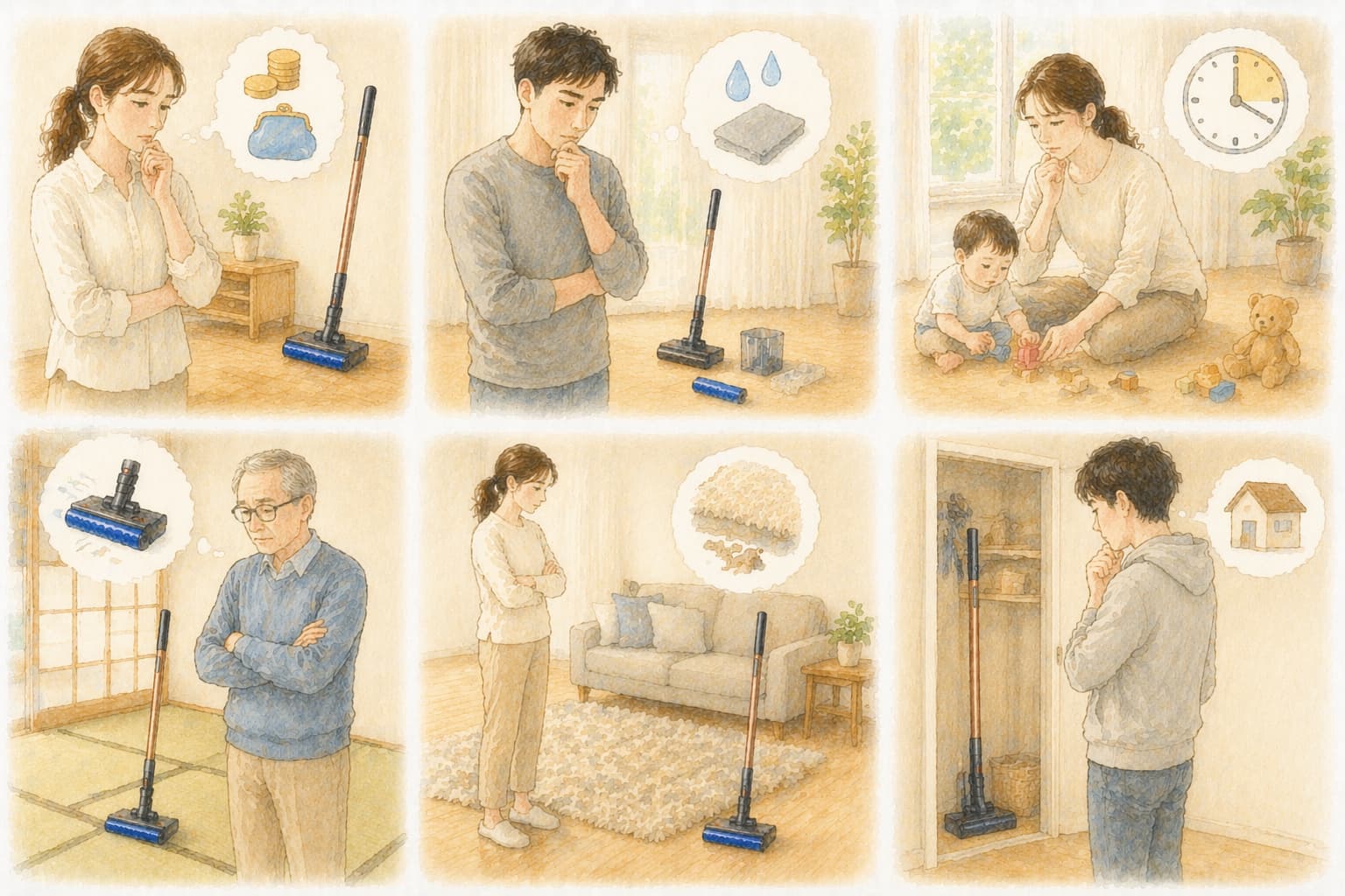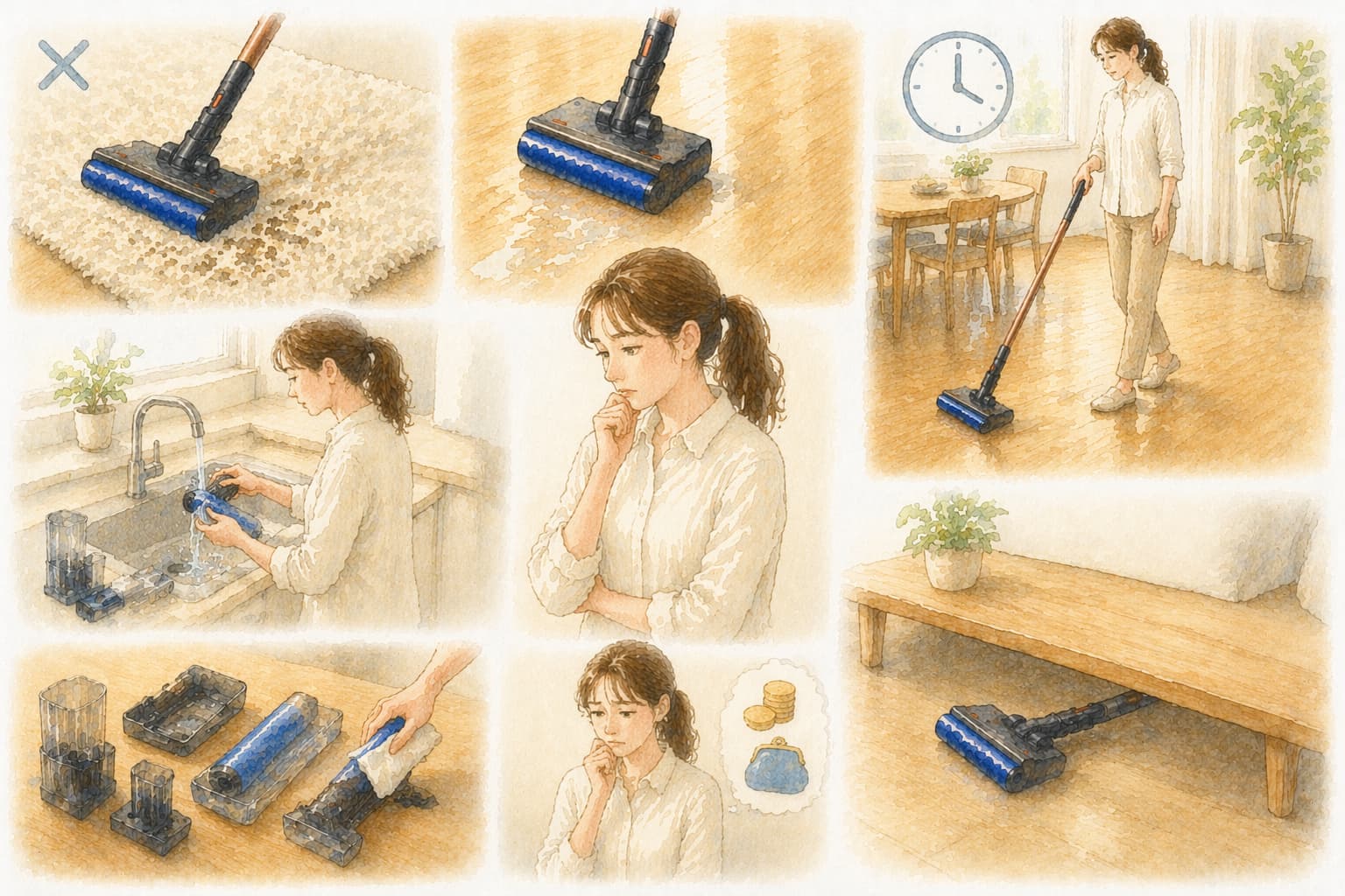 特に、一台で何でも済ませたい人、広い家を一気に掃除したい人、メンテナンスの手間を極力避けたい人は、期待とのズレが出やすいかもしれません。