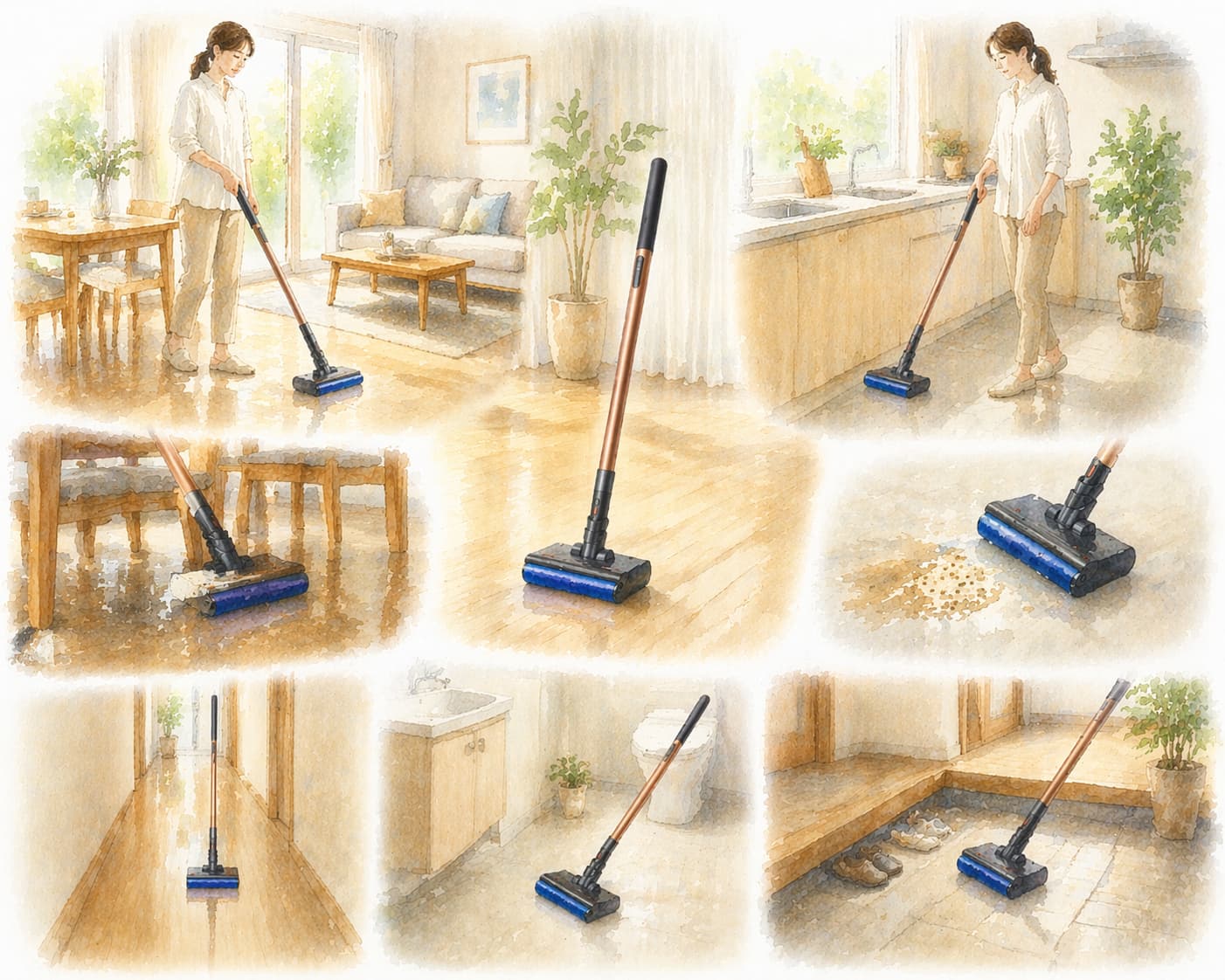 リビングやダイニング、キッチンまわりなど、日常的に床の汚れが気になりやすい場所で活躍しやすい一台です。