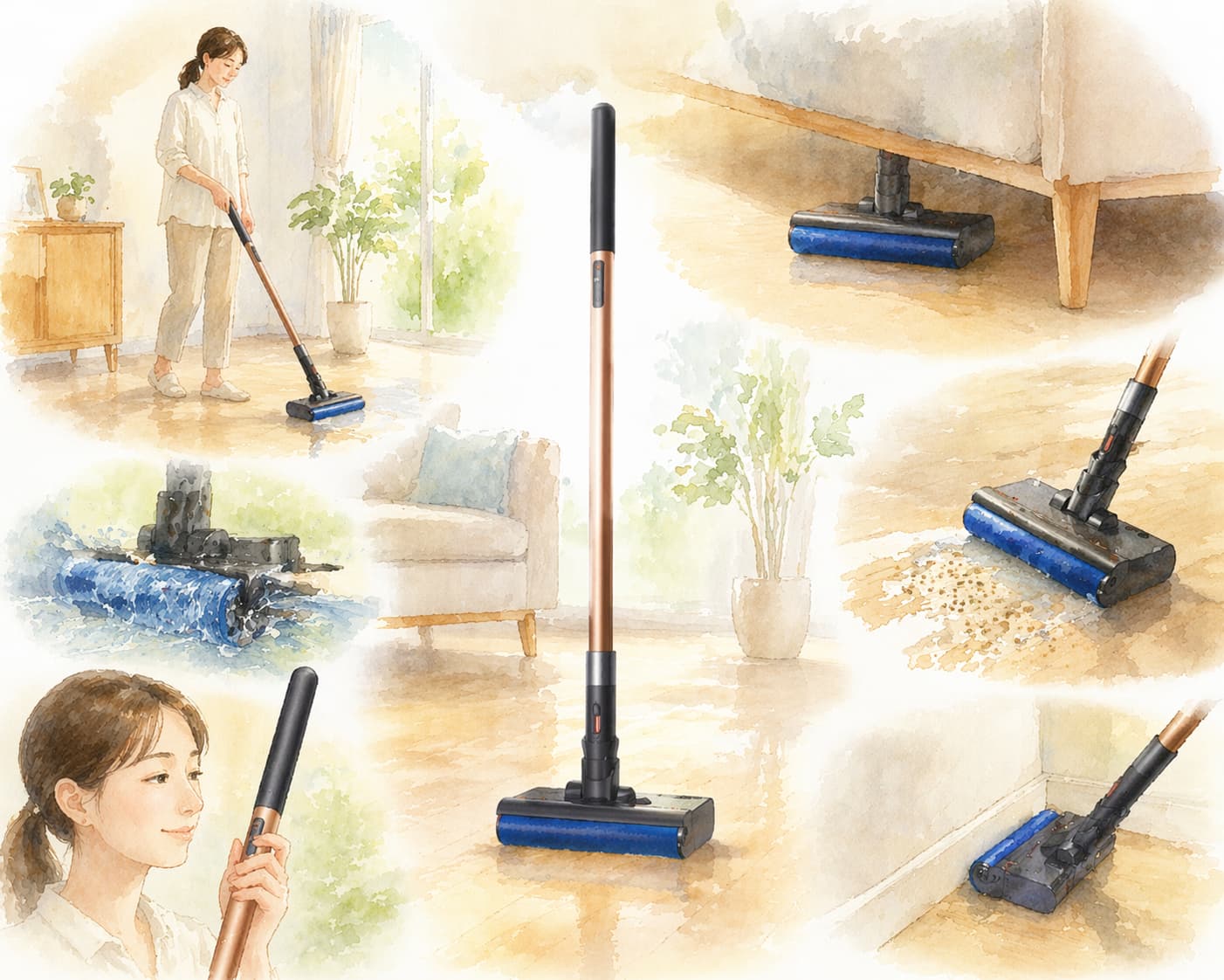 一般的なコードレス掃除機のように、強い吸引で家中のごみを一気に集めることを主役にした製品ではなく、床のベタつきや皮脂汚れ、食べこぼしの跡などをすっきり整えたいときに使いやすいのが大きな特徴です。