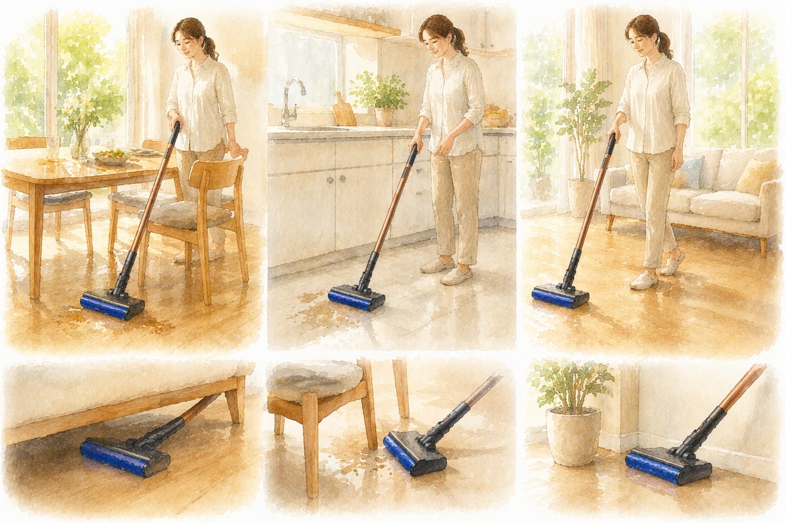 床掃除で意外とストレスになりやすいのが、家具の下や脚まわり、ちょっとしたすき間の掃除です。