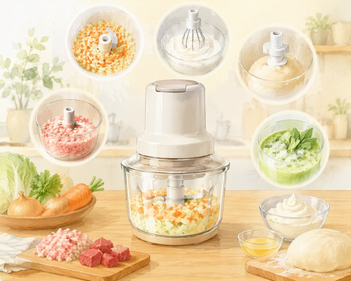 一般的なフードプロセッサーは、刻む、混ぜる、つぶすといった基本機能が中心になりやすいですが、このモデルはそこに泡立てや生地こねまで加わります。