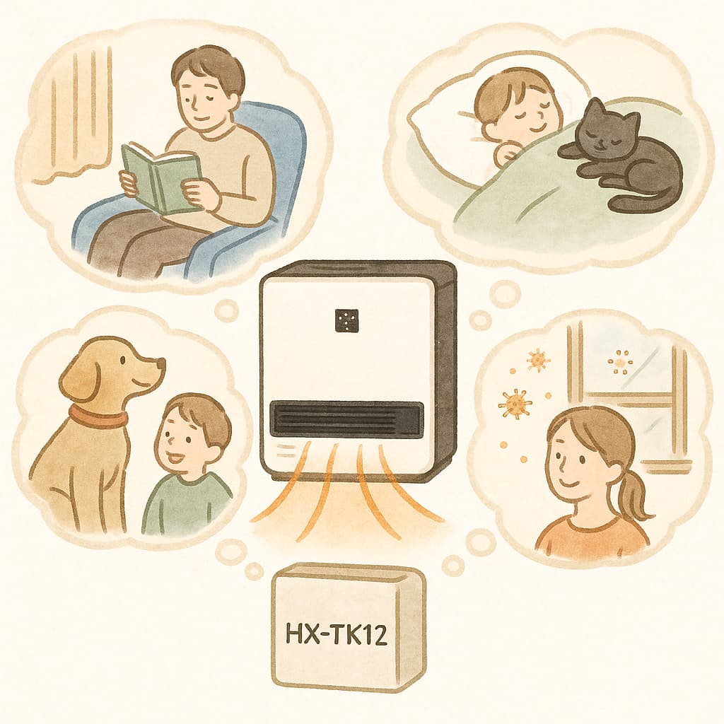 ・乾燥を防ぎつつ清潔な空気で過ごしたい → 加湿+空気浄化+暖房を同時にこなすHX-TK12
