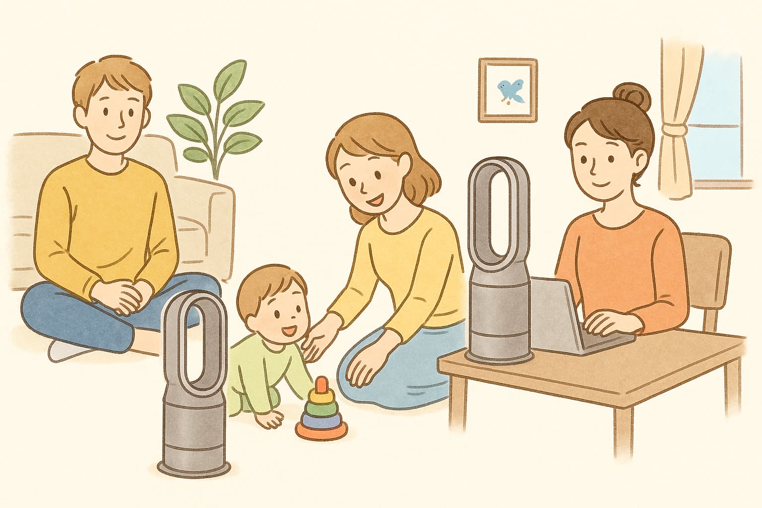 また、空気清浄機能がついたモデルでは、細かいホコリやニオイの原因をキャッチしながら、キレイな空気を循環してくれるため、小さなお子さまがいるご家庭や、ペットと暮らしている方にも喜ばれています。